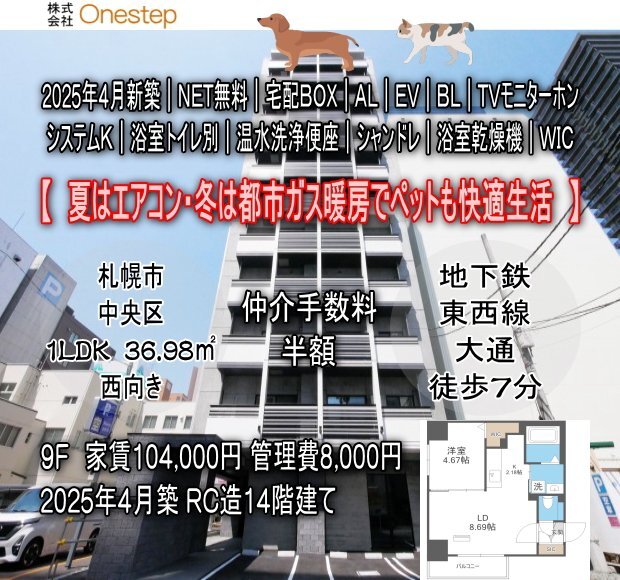 2025年4月新築!夏はエアコン・冬は都市ガス暖房でペットも快適生活! 駐車場27,500円・NET無料・宅配BOX・AL・EV・BL・システムK・浴室乾燥機など人気条件が充実! 札幌市中央区南1条西8丁目 地下鉄東西線 大通駅 徒歩7分 物件詳細 onestep-baibai.co.jp/chintai/detail… #仲介手数料無料 pic.x.com/iEzy2QkCX1