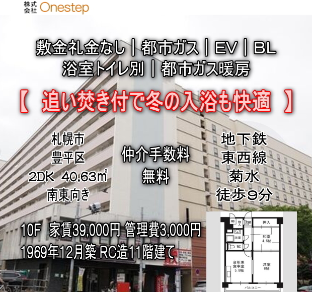 追い焚き付で冬の入浴も快適! 敷金礼金なし・都市ガス・EV・BL・浴室トイレ別・都市ガス暖房など人気条件が充実! 札幌市豊平区豊平4条1丁目 地下鉄東西線 菊水駅 徒歩9分 物件詳細 onestep-baibai.co.jp/chintai/detail… #仲介手数料無料 #札幌賃貸 #札幌部屋探し #札幌物件探し #札幌不動産 #札幌転勤 pic.x.com/uH2VzCk5lx
