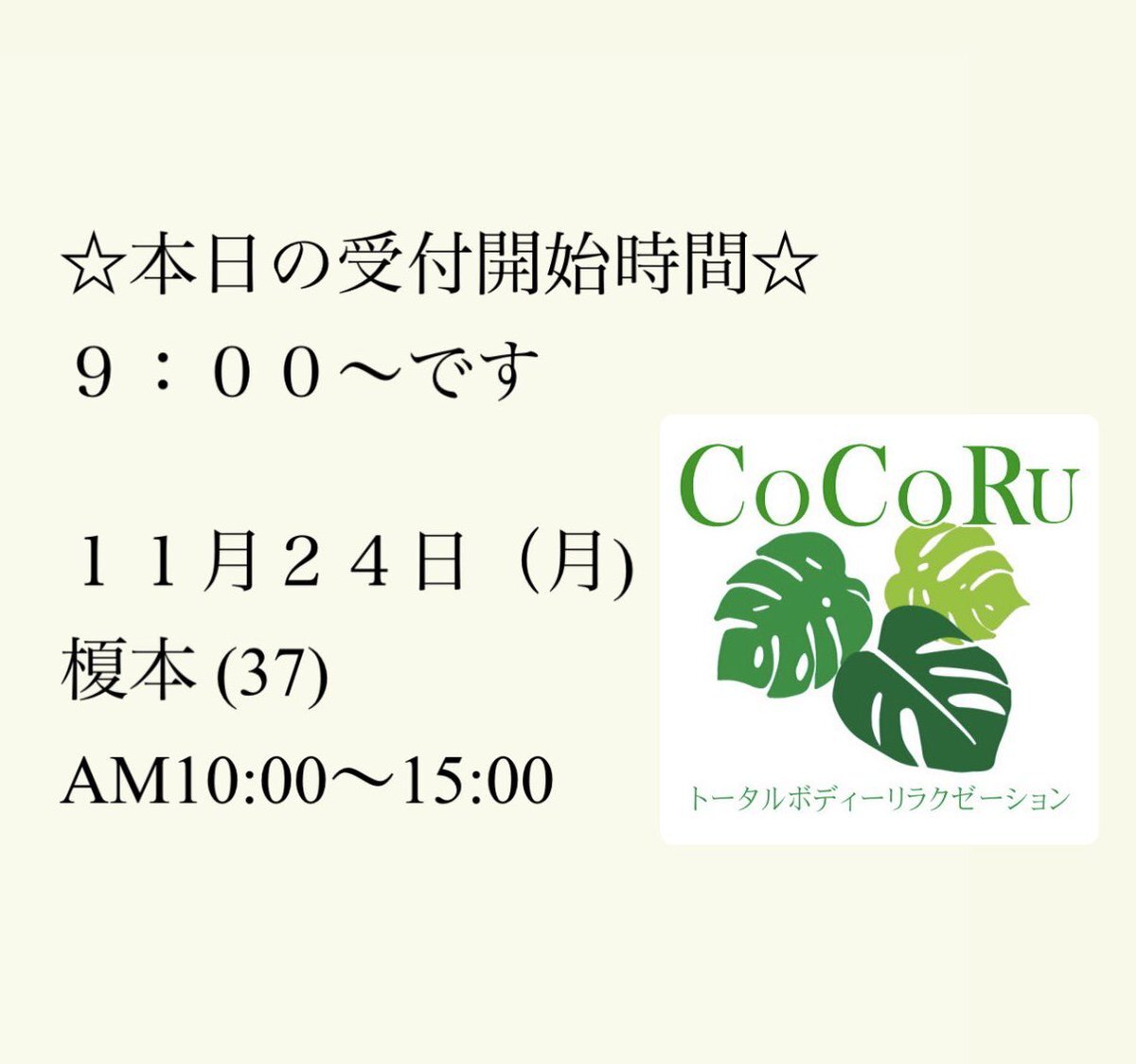 • ★11.24(月)★ 本日の受付開始時間は 9:00からになります🌿 #トータルボディーリラクゼーション #アロマオイル #トリートメント #ココル #群馬県 #伊勢崎市 #サロン #プライベートサロン #パウダー #脱毛 #ワックス脱毛 pic.x.com/EUDfpZpC2F