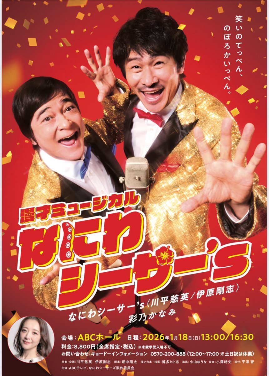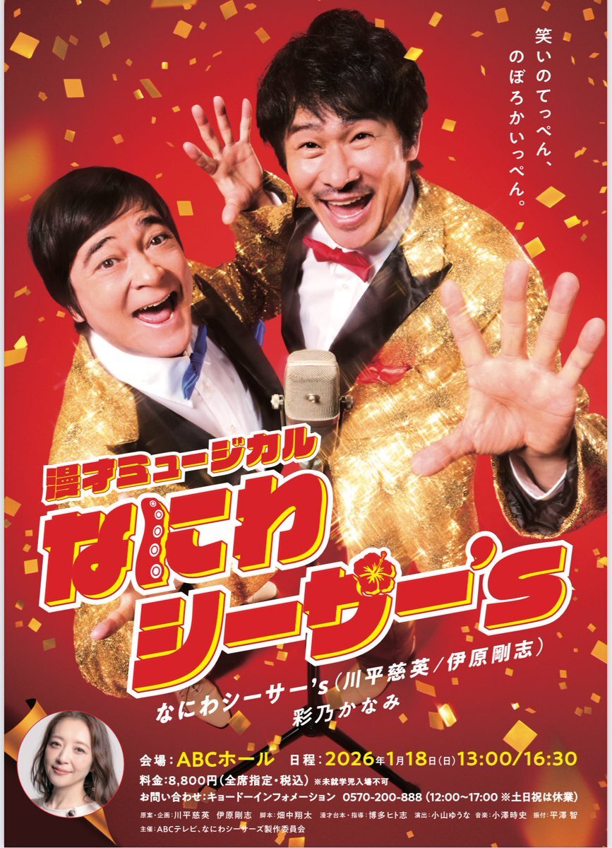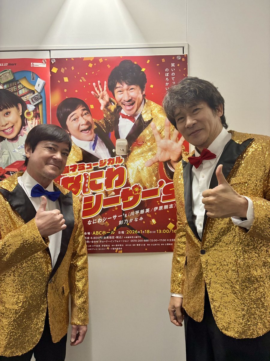 // 📢公演チケット特別受付中‼ \\ #川平慈英 と #伊原剛志 のコンビで贈る 漫才ミュージカル『#なにわシーサー’s」 😀大阪公演‼😀 📅 1月18日(日) 13:00 / 16:30 📍大阪・ABCホール 📺ABCテレビ「newsおかえり」専用チケット受付はこちら👇 w.pia.jp/p/naniwashisas… #彩乃かなみ pic.x.com/48WEia2IVM