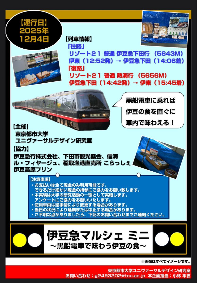 【第3弾始動!】 東京都市大学ユニヴァーサルデザイン研究室では、伊豆急行線内で「伊豆急マルシェ Mini」を12/4に行います。 リゾート21の営業列車内で大学生達が厳選した伊豆の食を味わいながら旅を楽しみませんか? 皆様のご利用をお待ちしております。 #東京都市大学 #伊豆急行 #鉄道 pic.x.com/7qXESDWrNe