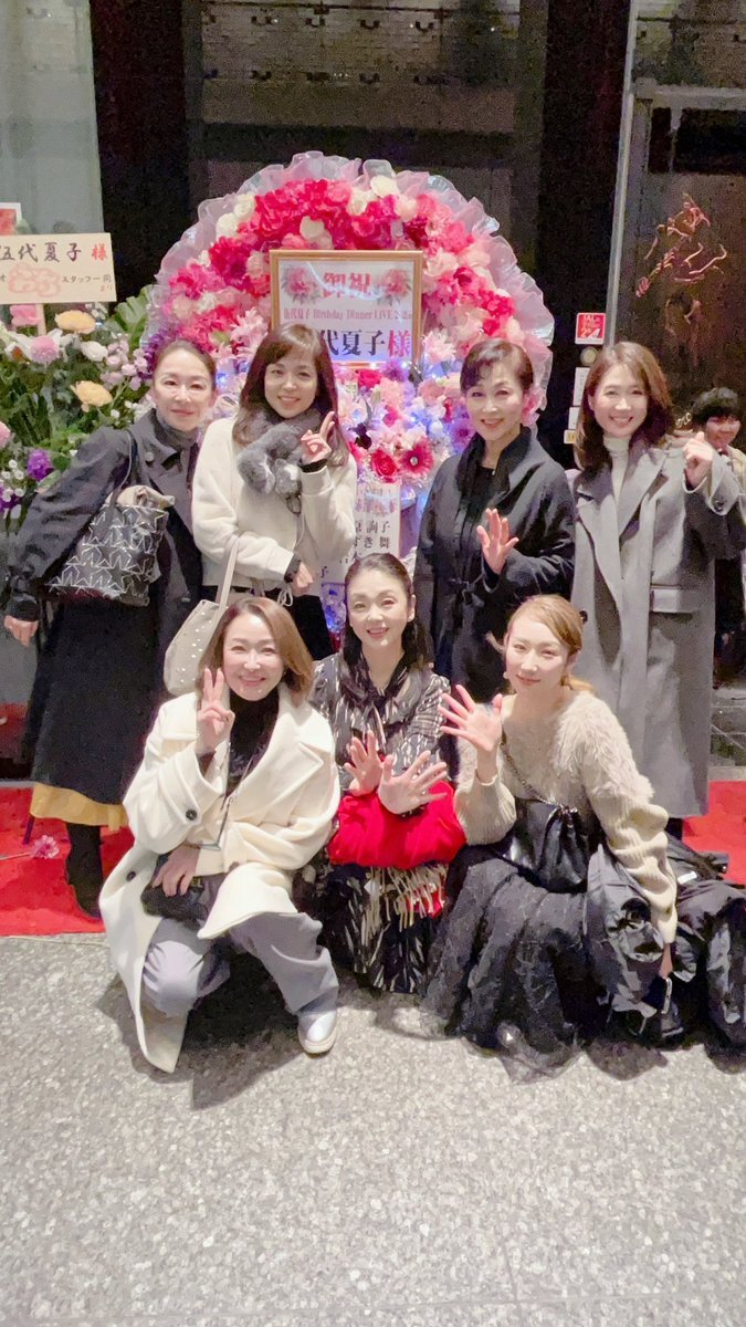 返信先:@shiinasachiko#伍代夏子 さんのBIRTHDAY LIVEに行かれたんですね。 #美魔女艶歌卓球部 勢揃い!😍 部長のなっちゃん綺麗すぎ😉 さっちゃんも負けじと頑張らねば🤭 それにしても、ゴージャスな御花ですね。😄✋️