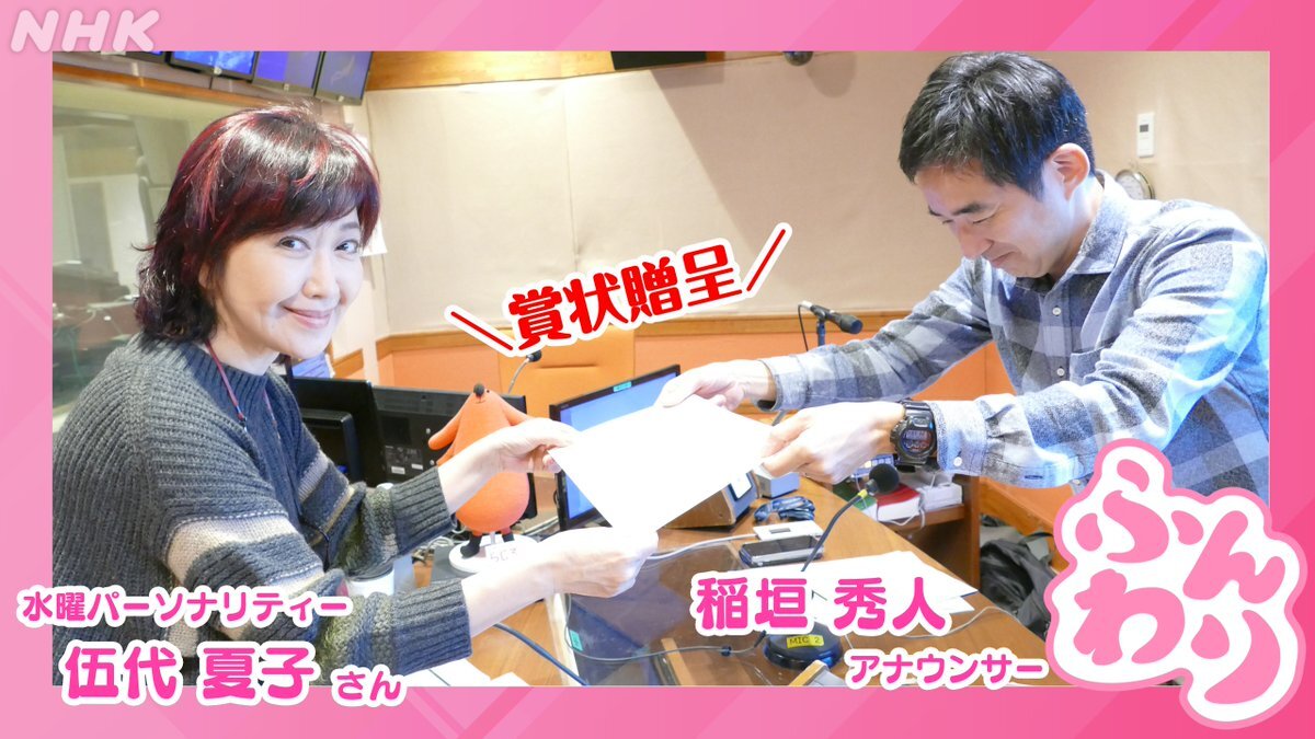 水曜パーソナリティー #伍代夏子 さん、進行 #稲垣秀人 アナでお送りする ⋱ 水曜日 #ふんわり ⋰ 稲垣アナ、なっちゃんに賞状を贈呈! 大賞、入賞、がんばったで賞…みなさんはどんな賞をもらったことがありますか?ぜひ教えて下さい。 👉️「らじる★らじる」はこちら! nhk.jp/radio pic.x.com/xacAXcmfZi