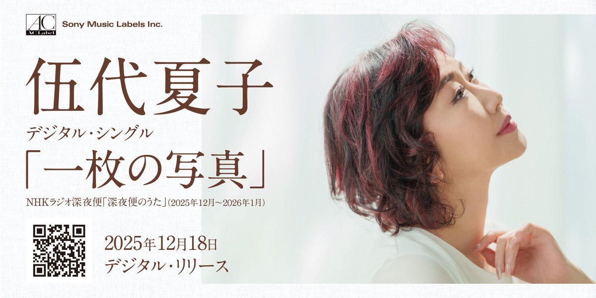 【#伍代夏子】 \#本日配信/ #NHK #ラジオ深夜便「深夜便のうた」(2025年12月~2026年1月)となる自身初のデジタル・シングル「一枚の写真」が伍代夏子の誕生日である12月18日より配信開始🎧 ⬇️詳細・配信はこちら 110107.com/godai_shashin pic.x.com/F8TrTKCqvG