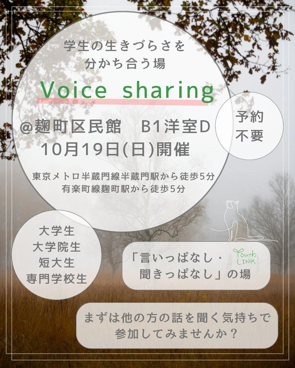 【あなたの #生きづらさ、話してみませんか💬】 10/19(日)に、学生が悩みやモヤモヤを語りあえる #居場所『Voice sharing』を開催します🍁 日時:10/19(日) 14時~16時 場所:千代田区 麹町区民館 B1 洋室D (東京メトロ半蔵門駅から徒歩5分、麹町駅から徒歩5分) ★続く投稿もお読みください。