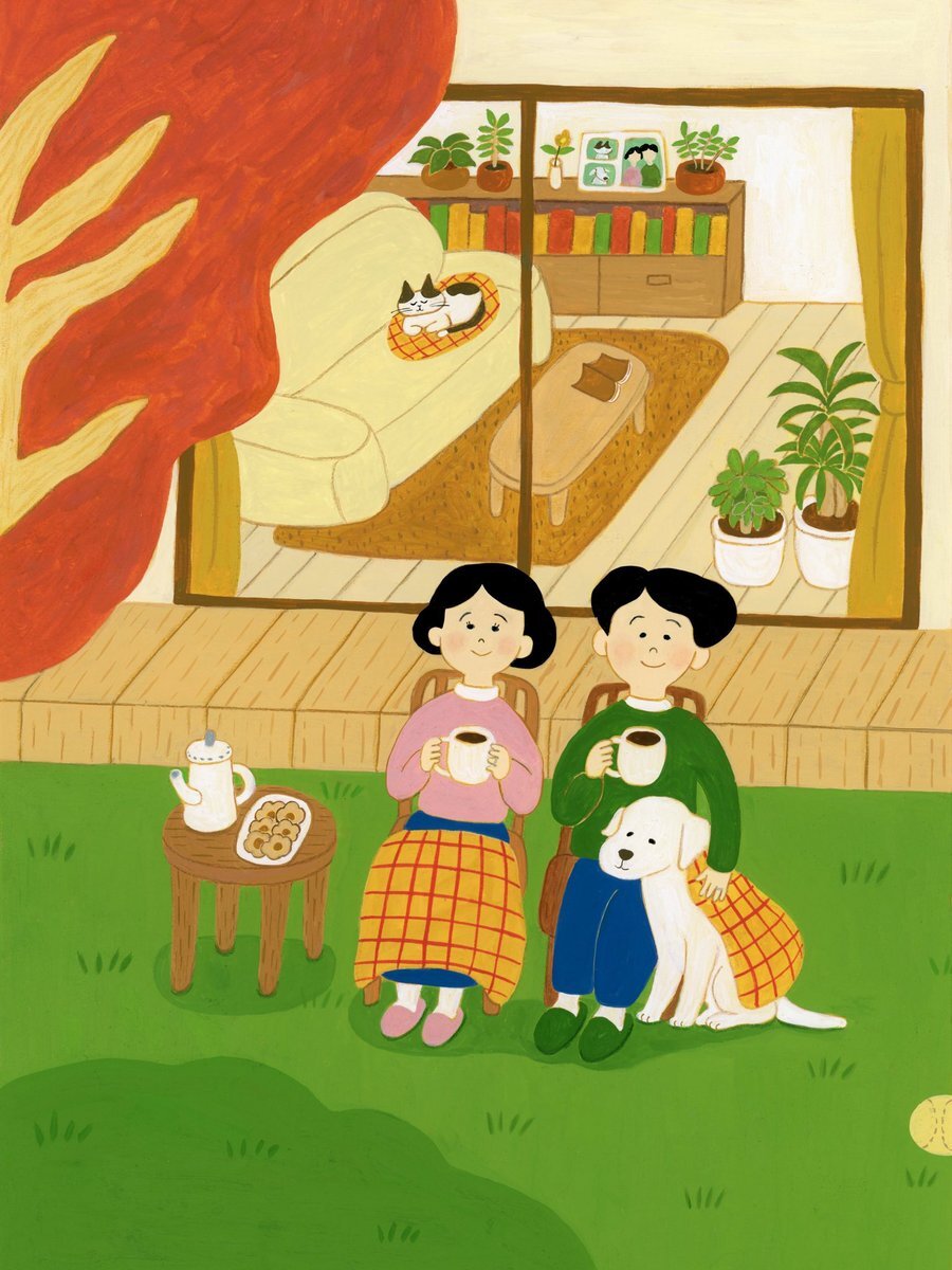 庭でのんびり過ごす夫婦🏠🌲 パレットクラブ🌈 吉岡ゆうこさんによる課題「不動産の会報誌の表紙を描く」 実際の仕事を想定して描く課題でした! 広い庭への憧れから自分が住んでみたい家のイメージで描きました!🐶🌲 #イラストレーション #イラスト #イラストレーター #会報誌 #パレットクラブ pic.x.com/8EaSN1gl40