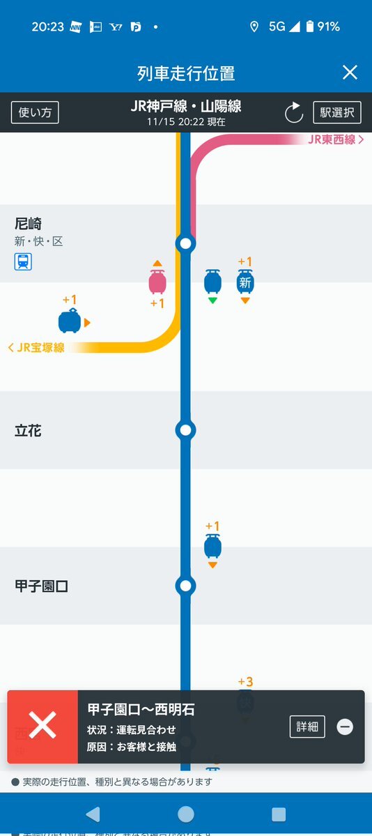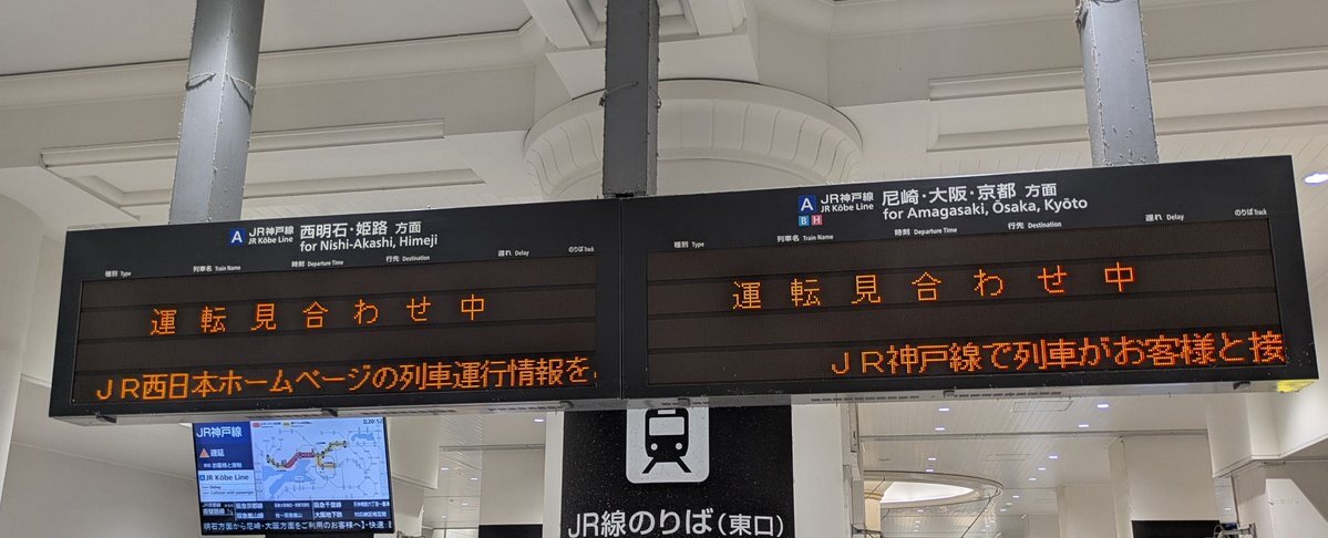 JR神戸線:住吉駅で列車がお客様と接触したため、甲子園口駅〜西明石駅間で運転を見合わせ。 阪神、六甲ライナーの振替輸送はなし。阪神は甲子園でのイベント。六甲ライナーは住吉から乗車で魚崎下車で阪神に乗れるからだと思う。 #JR神戸線 #JR西日本 #振替輸送 #神戸 #運転見合わせ #住吉駅 pic.x.com/QswfAmHFR1