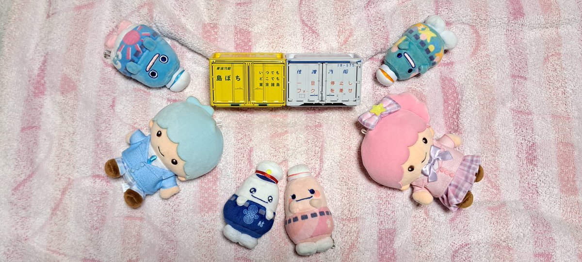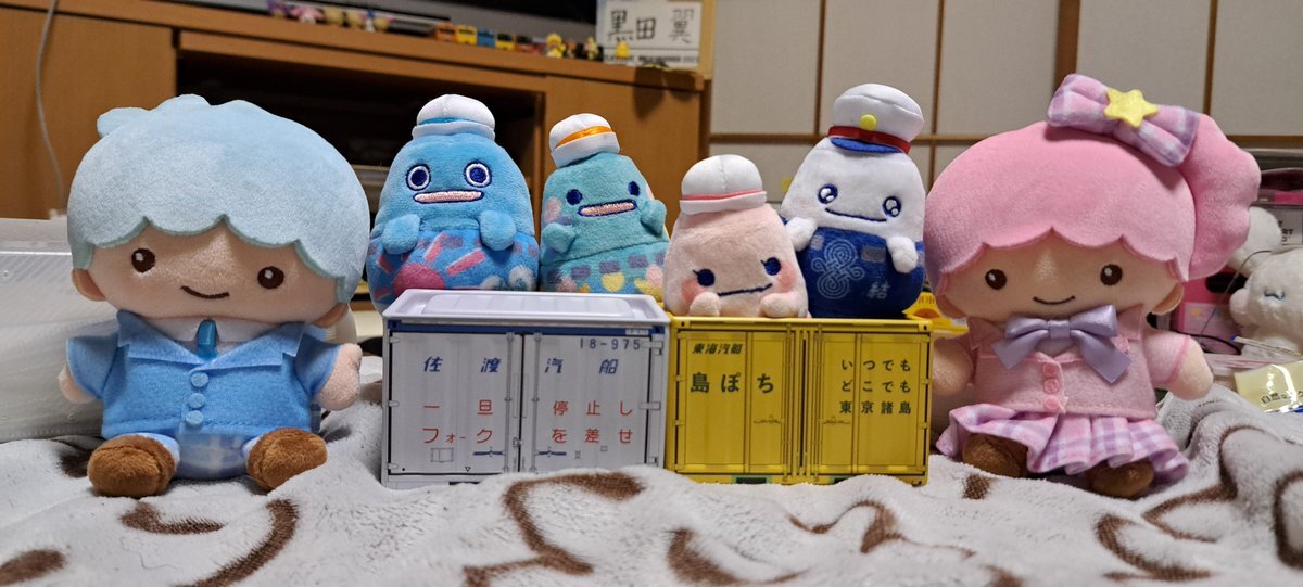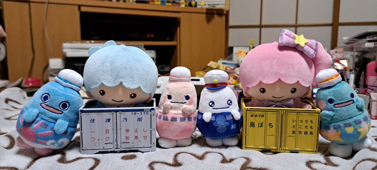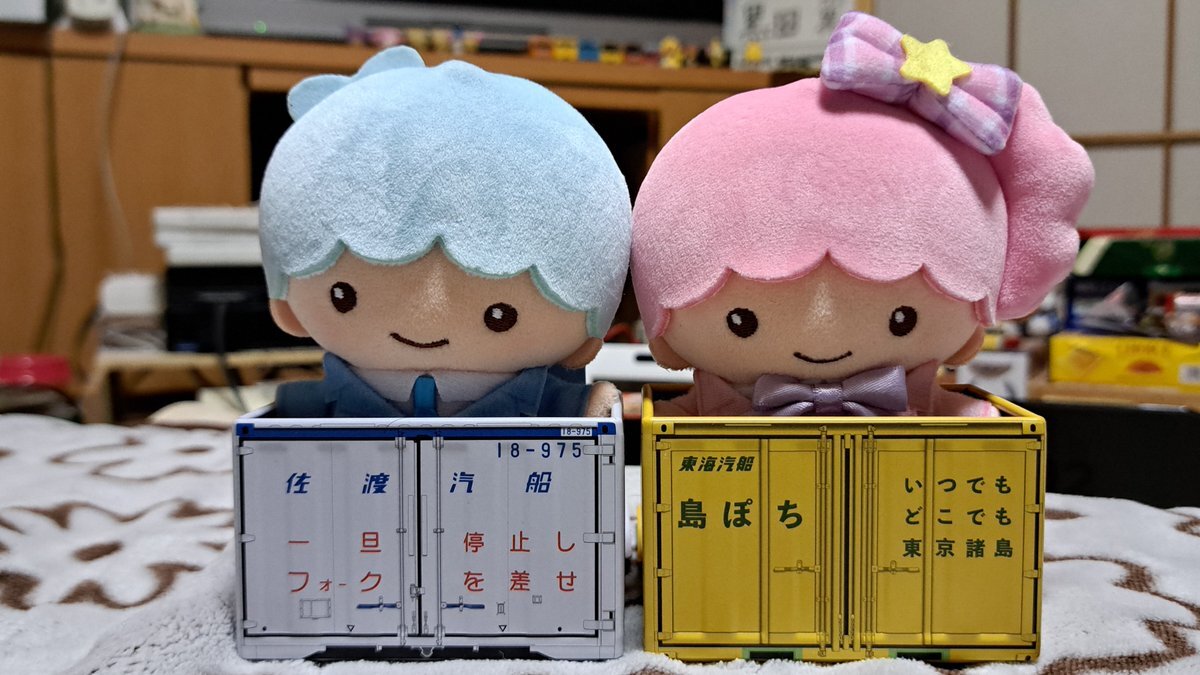 2025.12.6 はこぶね課×推しキャラ共演旅 ブリックコンテナ 最初のショットを撮った位置で、今年、デビュー50周年を迎えるリトルツインスターズとも共演!! 意外にも、ブリックコンテナにぴったり入ってまうほど!! #東海汽船 #島ぽち #はこぶね課 #サンリオ #リトルツインスターズ #佐渡汽船 pic.x.com/BE9GfqwKY3