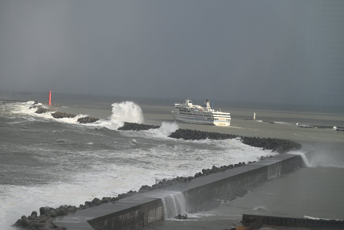 師走に入り日本海に冬の荒波の季節がやってきました。この日の波高は約5mと大荒れですが #新潟港西防波堤 により港内は穏やかです。 写真の船舶は #佐渡汽船「#おけさ丸」 pic.x.com/OzBmLn33A8