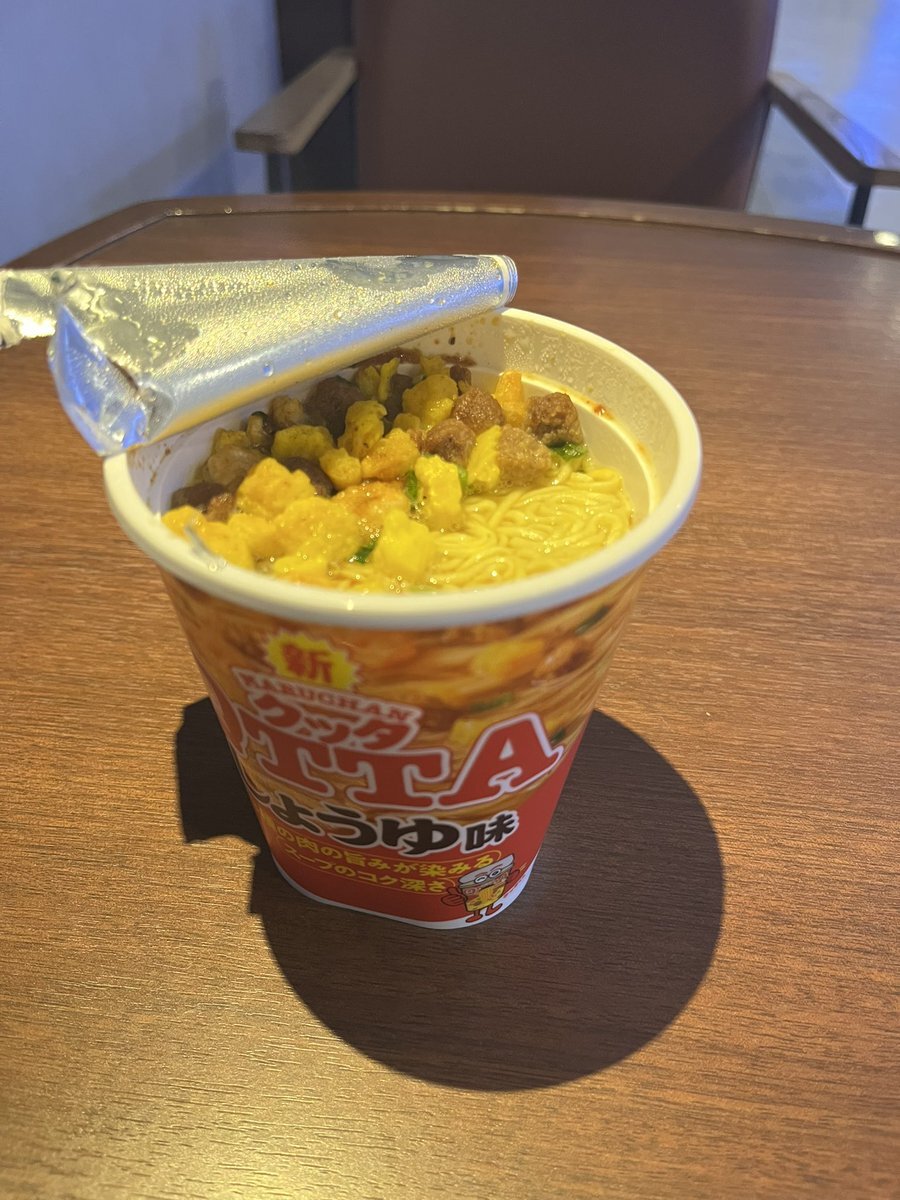 船内で食べるならカップヌードル一択という説もありますが、たまにはクッタで……朝イチは軽食コーナーの営業なし。代わりに自販機で弁当も置いてます 外の風景でも撮ろうと思いましたが私の身体では危ないぐらいの揺れなのでやめました。酔いやすい人はキツイかも #佐渡汽船 #日々のラーメン日記 pic.x.com/Jr08DhHd85
