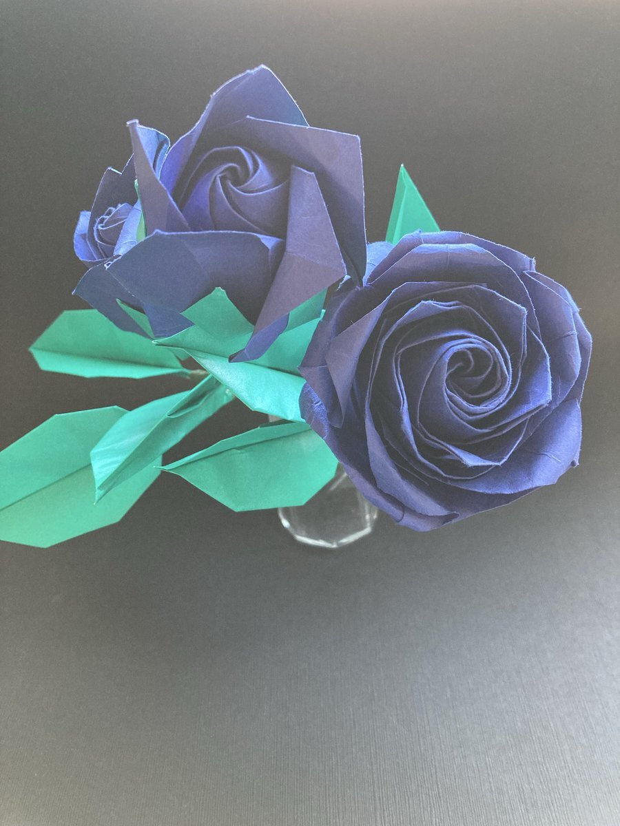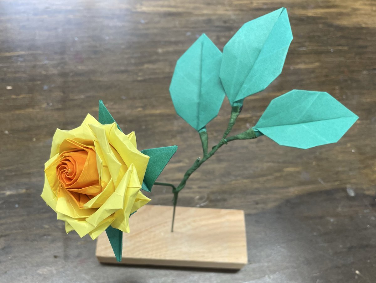 本気の佐藤ローズ 紙に色を塗って折りました 隣接トーン中差色相配色でメリハリかつまとまりを出しました 右から左へ6〜9くらいの色相になっています 土台の木も切り出しました(挿せるように) @NaomikiSato ⬅️ #ハイブリッドティーローズ #佐藤ローズ #折り紙 #薔薇 pic.x.com/eKfVN6to4q