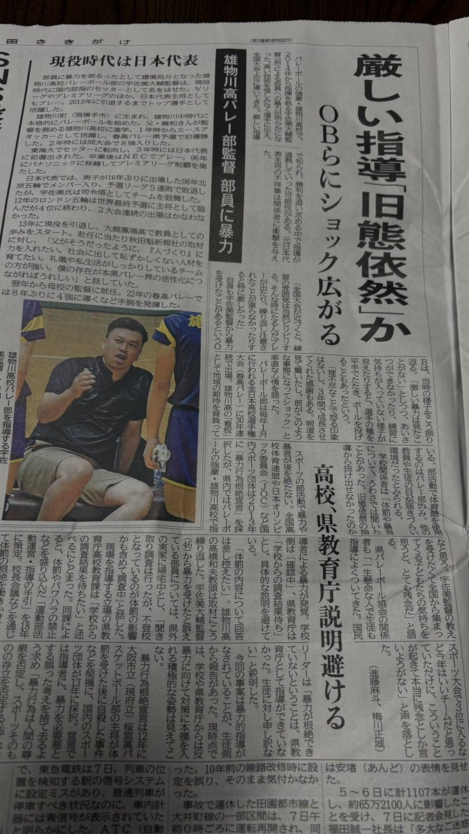 【判明】秋田のバレー強豪校、元日本代表・宇佐美大輔監督が部員に体罰か news.livedoor.com/article/detail… 秋田県立雄物川高男子バレーボール部の宇佐美大輔監督が部員を殴るなどの体罰をしていたことが7日、共同通信の取材で判明した。県バレーボール協会は1年間の謹慎処分としたという。