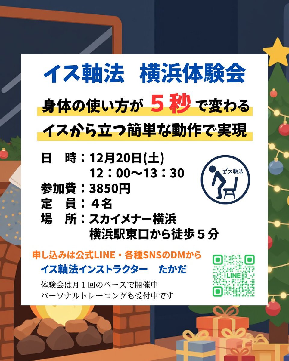 12月20日(土)に横浜駅近くで体験会を開催します 上手く使えなくなった身体を5秒の簡単な動作で取り戻す、他には無いメソッド・イス軸法 効率よく身体を動かせるようになりましょう ↓↓申し込みは私の公式LINEかDMで lin.ee/rEmTP5S #イス軸法体験会 #神奈川 #骨盤 #姿勢
