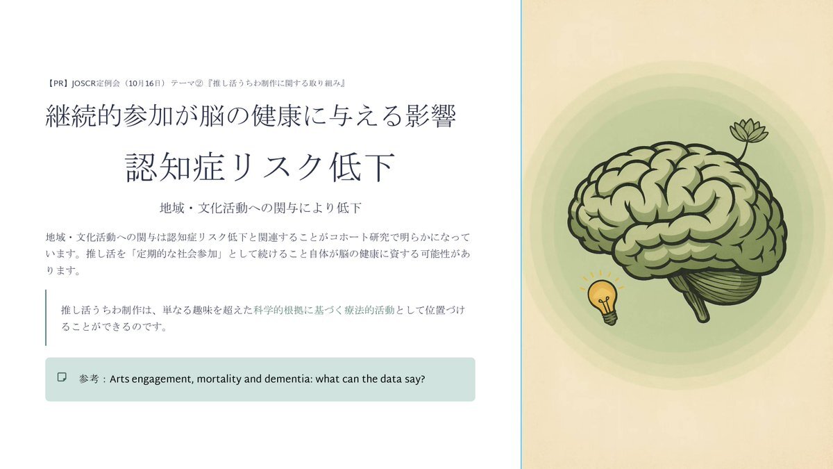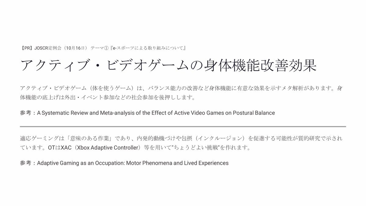 “好きなこと”が人を支える力になる。 #JOSCR 10月定例会では #eスポーツ や #推し活 を通して 作業療法の新しい可能性を語ります。 📅10/16(木)18:30〜20:00/Zoom 申込締切:本日まで forms.gle/kNpt8EfHJhi75A… #作業療法 #リハビリ #サブカルチャー pic.x.com/kwMuupFuCs
