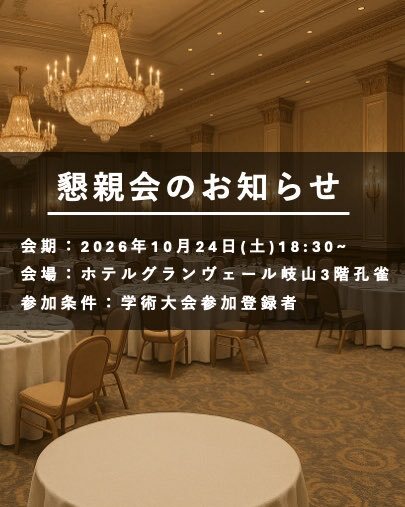 第26回関節ファシリテーション学会学術大会の懇親会が行われます。学術大会1日目終了後です。全国の方と親睦を深めるまたとない機会です。参加お待ちしています。 申し込み→ docs.google.com/forms/d/e/1FAI… #sjf #理学療法 #作業療法 pic.x.com/tATFPaZK58