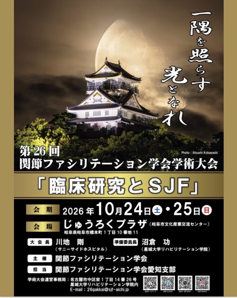 愛知県支部主催 第26回関節ファシリテ−ション学会学術大会を岐阜市で開催をいたします。 【開催日時】2026年10月24日(土)~10月25日(日) 【テーマ】「臨床研究とSJF」 【会場】じゅうろくプラザ(岐阜市文化産業交流センター) 参加登録→ sjf-aichi.jp/26gakkai/ #sjf #理学療法 #作業療法 pic.x.com/cNQMLD5P2b