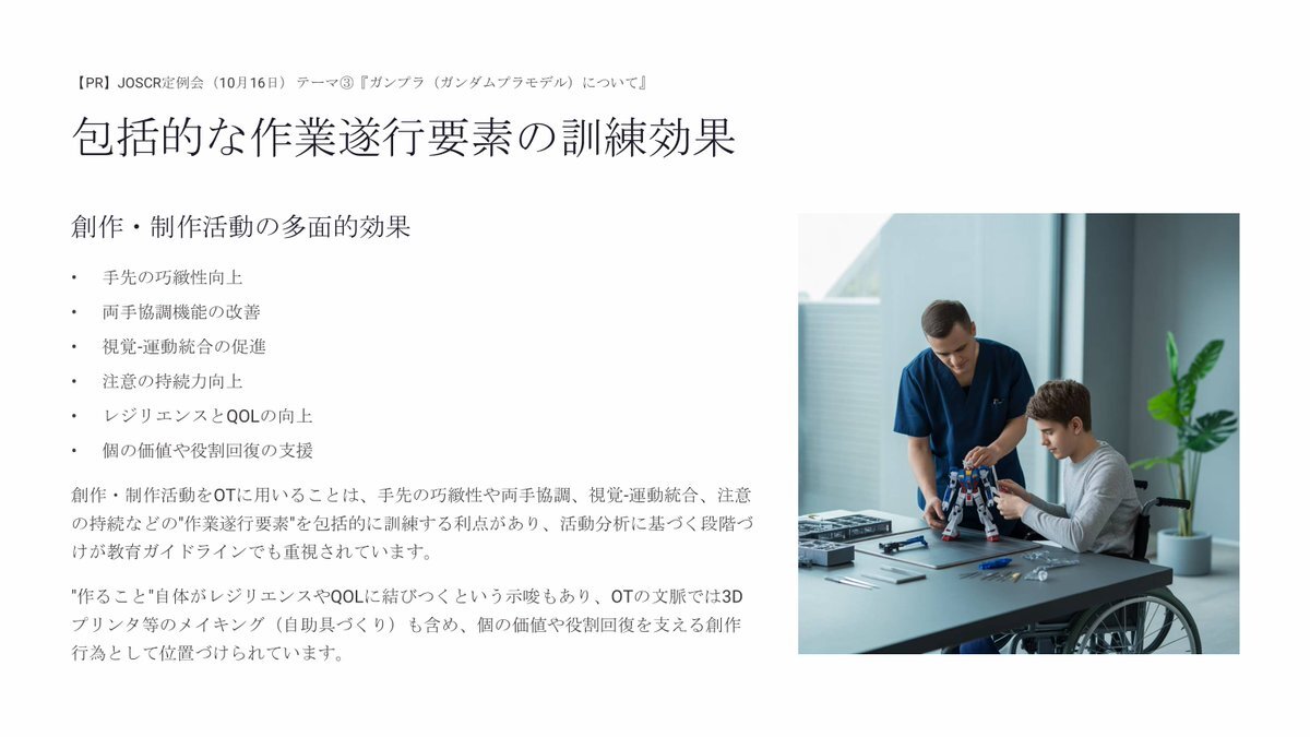 「作業療法において、事例こそ最も大事」 一人の子どもとの関わりを丁寧に見つめること。 他の施設の支援を知り、 他の作業療法士の視点に触れること。 その積み重ねこそが、 現場で迷わずに関わる力になります。 sites.google.com/view/otjireike… #作業療法 #事例検討 pic.x.com/s6GTh3LPgd