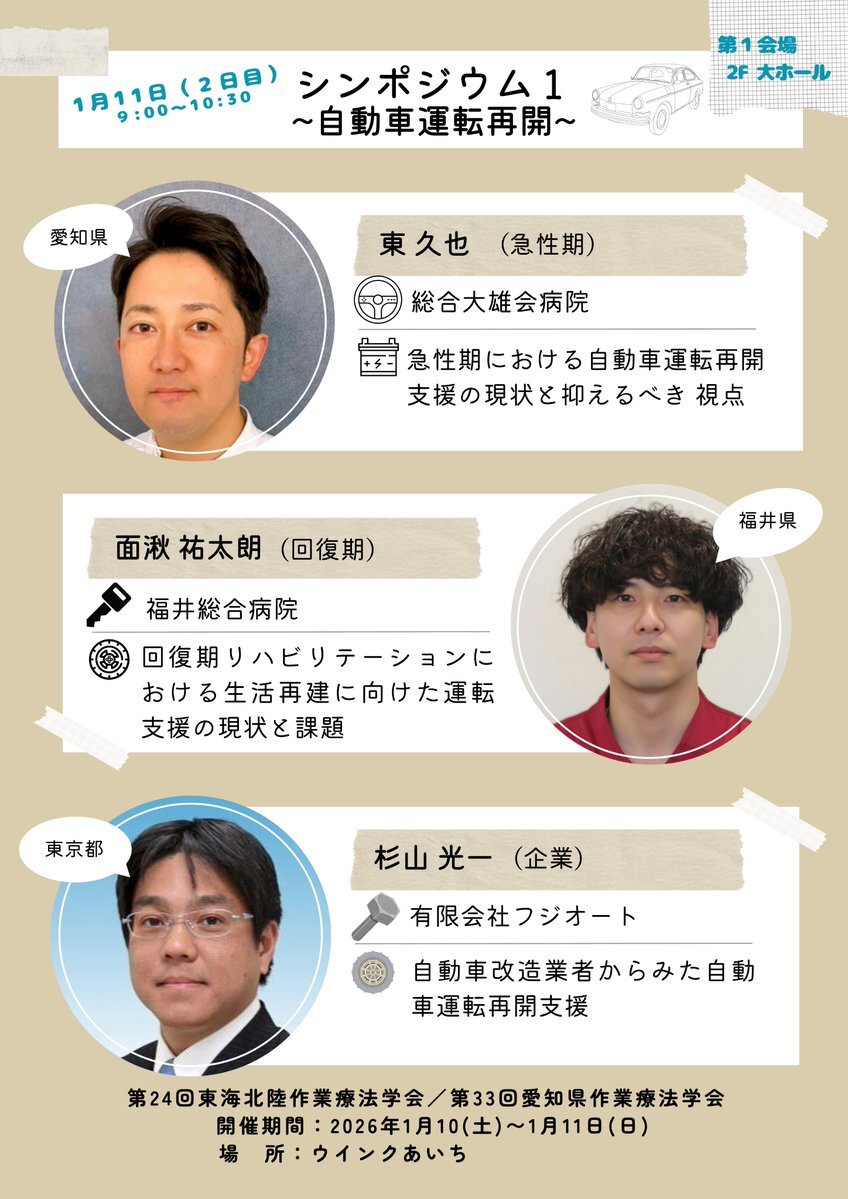 【シンポジウム情報】その1 1/11 (日) シンポジウム1 テーマは「自動車運転再開」です! 急性期・回復期・企業の立場から、3名のシンポジストにご登壇いただきます! #東海北陸作業療法学会 #愛知作業療法学会 #作業療法 #自動車運転再開 #運転再開 #シンポジウム #学会 #tkhrot24 pic.x.com/6RGy1dbz7B