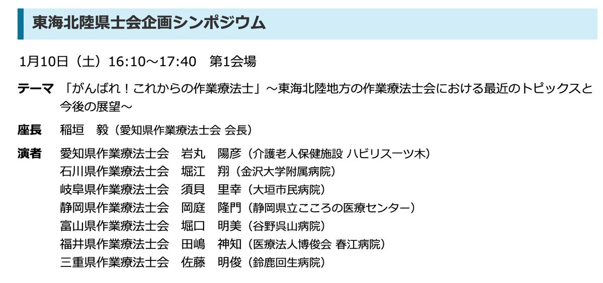 【東海北陸県士会企画シンポジウム】 1/10(土) 16:10-17:40 第一会場 東海北陸地方の作業療法士会の代表者より、各県士会における最近の取り組みや活動についてご紹介いただきます!ぜひともお楽しみに!! #東海北陸作業療法学会 #愛知作業療法学会 #作業療法 #作業療法士 #OT #学会 #tkhrot24