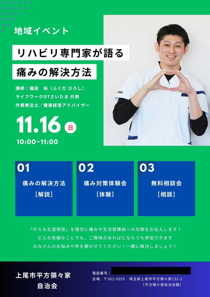 イベントチラシができました❗️ 生まれ育った故郷に恩返しすべく 作業療法スキルを大いに振います💪✨ #健康づくり #上尾市 #自治会 #作業療法 pic.x.com/JYprYeTZK7 x.com/mttk_ot/status…