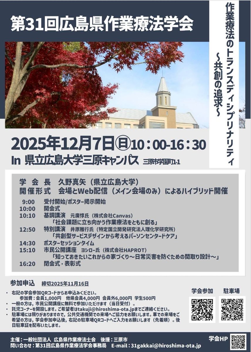 第31回広島県作業療法学会🌿 テーマは「作業療法のトランスディシプリナリティ〜共創の追求〜」 他県士会員・会員外の方も参加可能です。 会場&オンラインのハイブリッド開催🕊 12月7日(日)県立広島大学三原キャンパスにて。 #作業療法 #広島 pic.x.com/PSJNkJm9mT