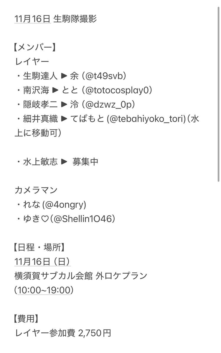 【併せ募集】 11月16日に横須賀サブカル会館にて生駒隊撮影を行うため、水上敏志レイヤー様または細井真織レイヤー様を募集しております。 下記画像をご確認の上、ご興味のある方はリプやメンバーのDMまでお声がけください✉️ #併せ募集 #併せメンバー募集 pic.x.com/r6tIdE2Ylp