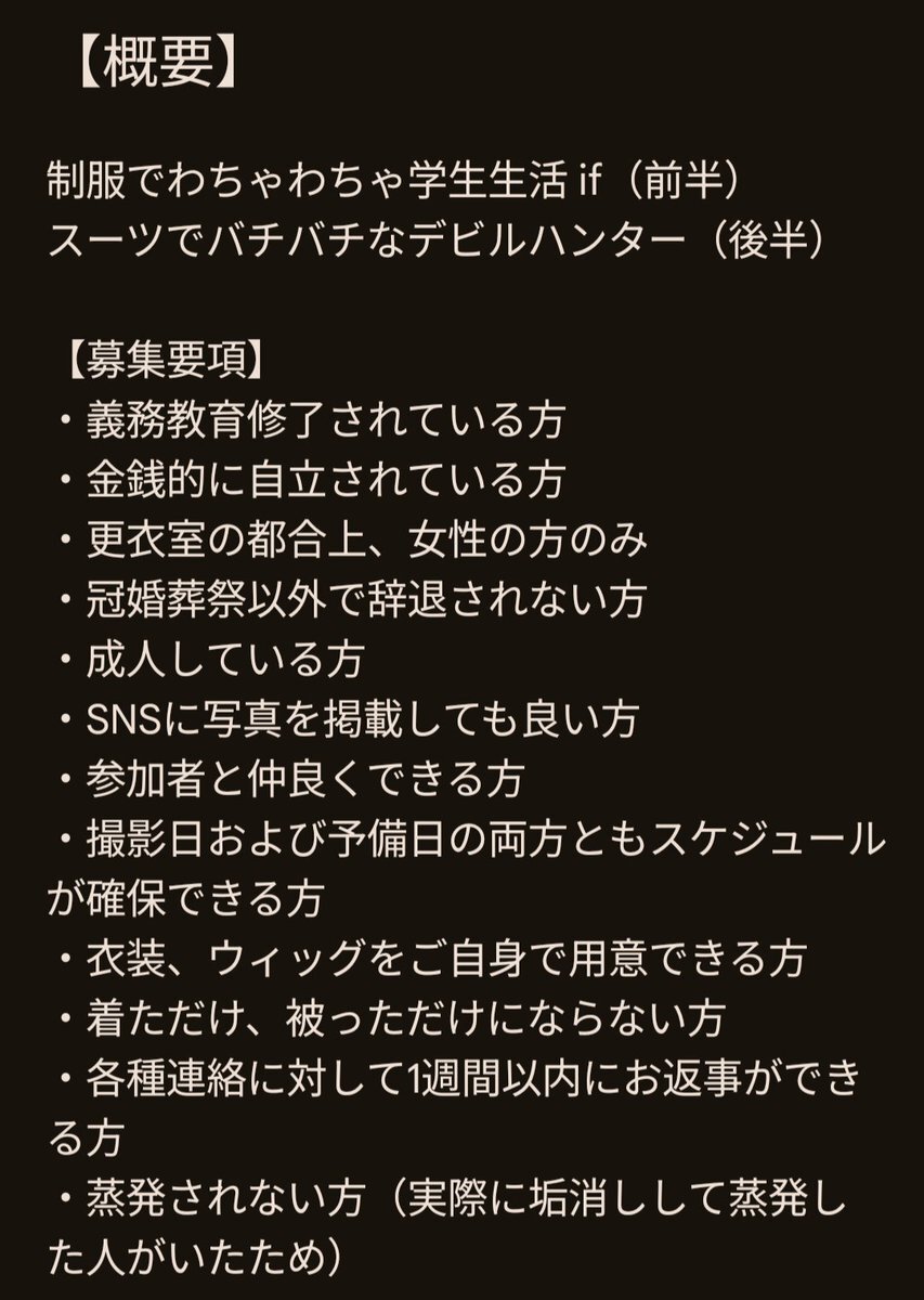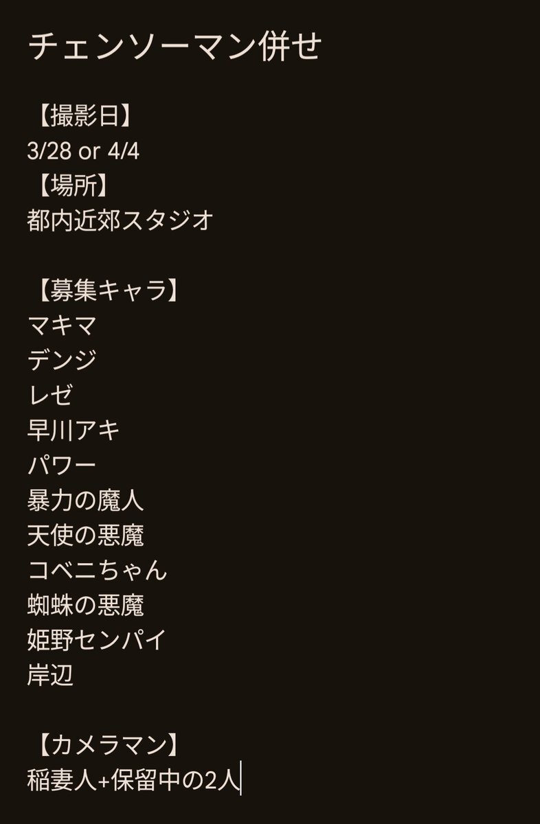 来年の3月末または4月頭にチェンソーマンの併せを撮りたいので、レイヤーさんを募集します! わちゃわちゃ学生生活とバチバチなデビルハンターで撮りたいです! ご興味ある方はこの投稿にリプライ、またはDMいただけますと幸いです🙇 #併せ募集 #併せメンバー募集 #拡散希望 pic.x.com/3WHwgolZOi