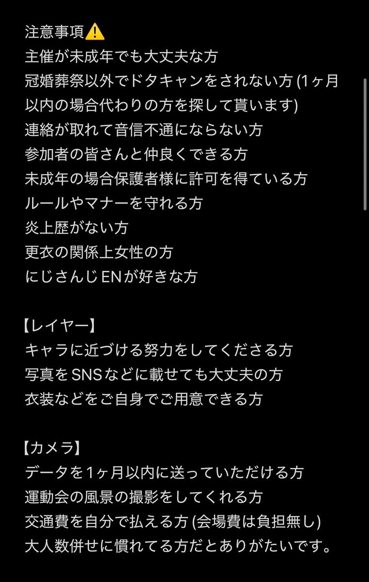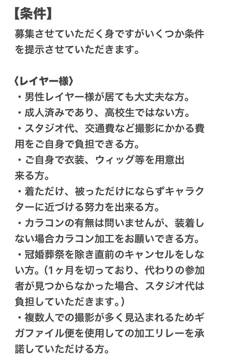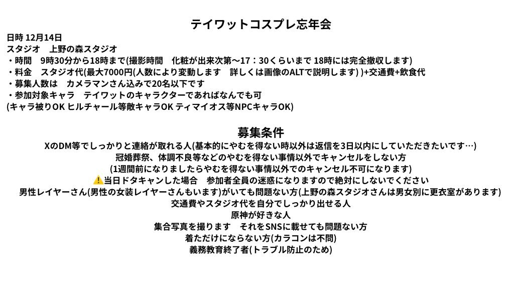 新垢も落ち着いてきたので併せ募集 12月14日 上野の森スタジオさんでテイワットコスプレ忘年会を開催します テイワットのキャラであればどんなキャラでも参加可能な併せになります 募集条件は画像にて詳細確認してください 気になる方は是非連絡してください #併せ募集 #併せメンバー募集 #原神併せ