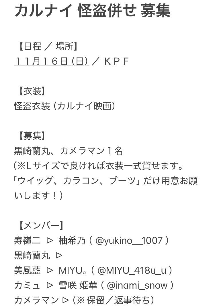 【 併せ募集 】 カルナイ怪盗併せで蘭丸枠に欠員が出ましたので急遽募集します! 条件につきましては画像を参考にして頂けると助かります。 FF外でも気になりましたらお声掛け頂けると嬉しいです😭🙌🏻 #併せ募集 #レイヤーさん募集 #カメラマンさん募集