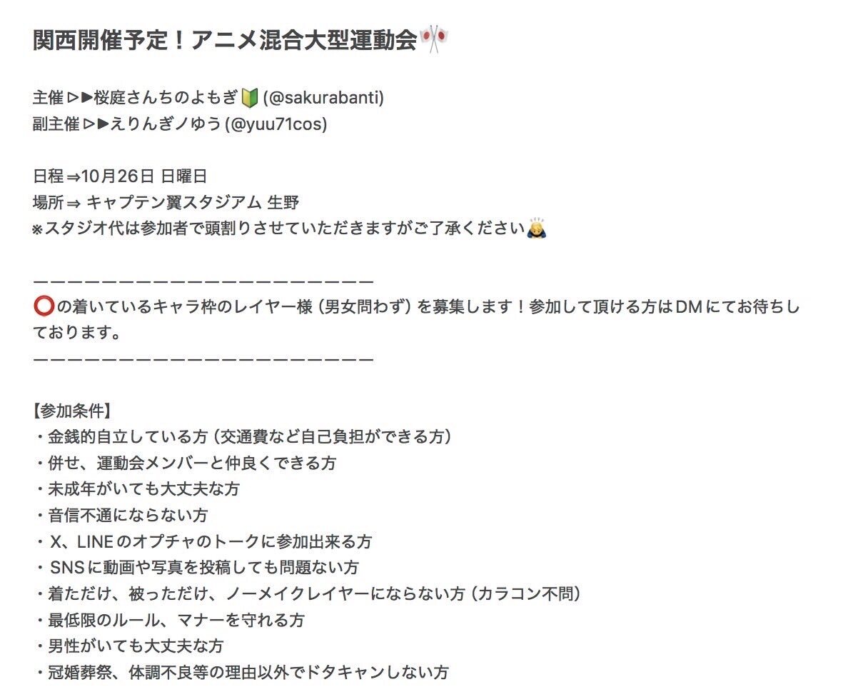 《関西アニメごちゃ混ぜ運動会・更新版》 運動会の参加者・カメラマン・アシスタント募集かけさせていただきます!! 男女問わず参加可能です! 興味ある方、参加してみたい方がいれば私か副主催のゆうさん(@yuu71cos )にDMください! 質問なども頂ければ回答させていただきます! #併せメンバー募集 pic.x.com/XeISNhcy7h