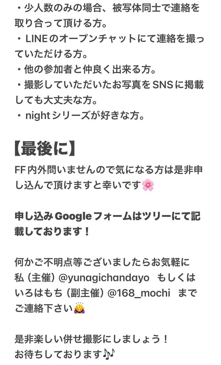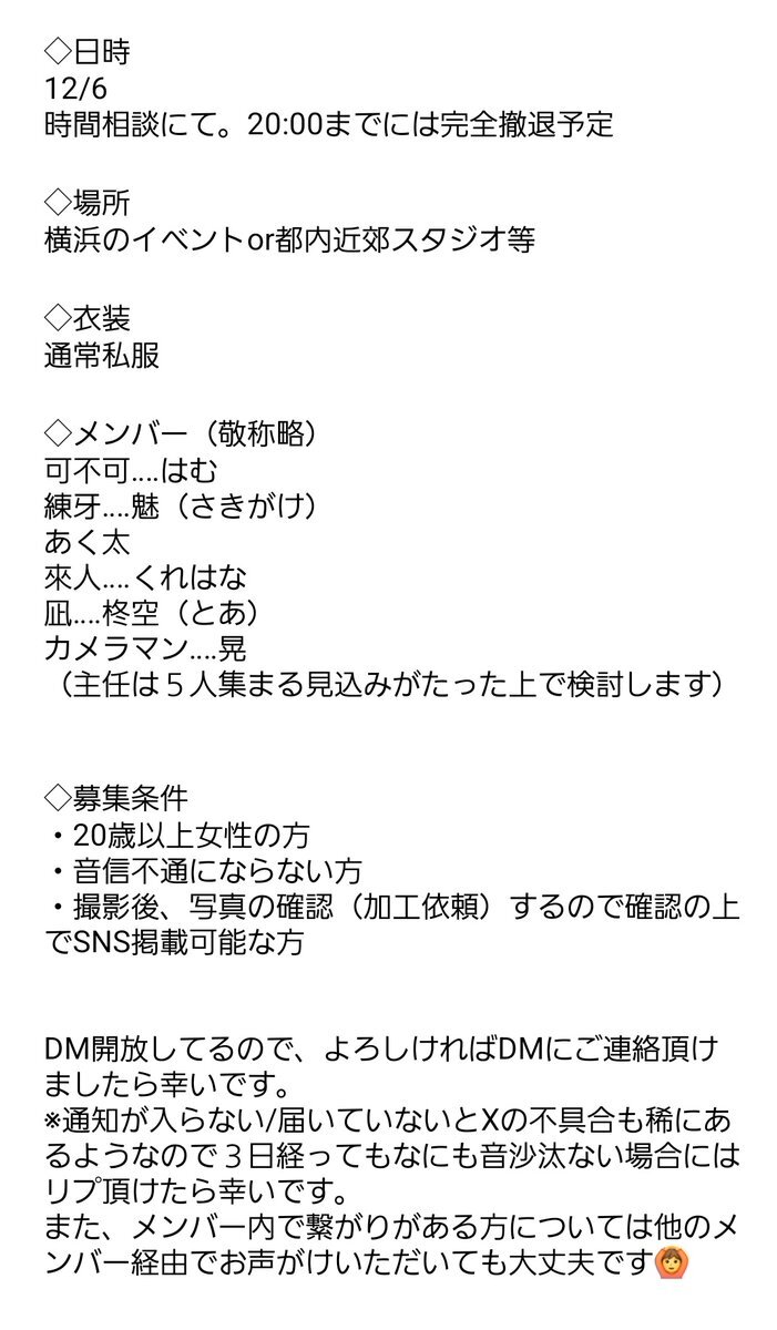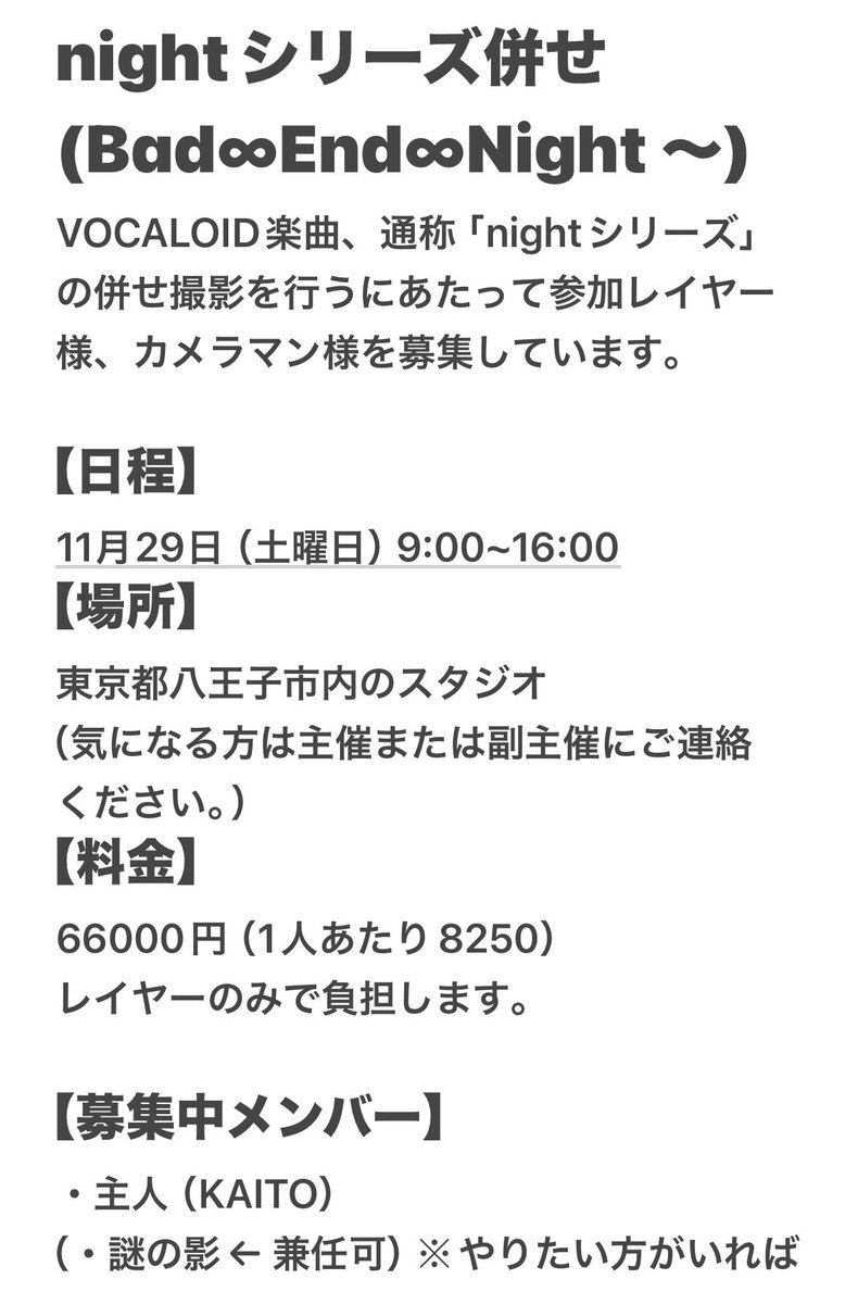 @no_TL 【ボカロ nightシリーズ併せ】 11/29(土)に八王子市内にて併せを行います🫧 気になる方がいましたらDMにてお声がけお待ちしております🍀 ラスト1役者のみなので是非‼️ どなたでも歓迎です😭😭😭😭 #併せ募集 #併せメンバー募集 #カメラマン募集 #レイヤー募集 x.com/yunagichandayo…