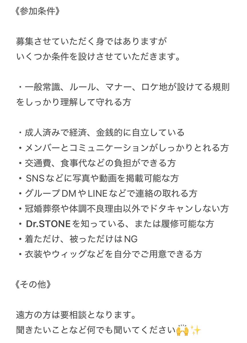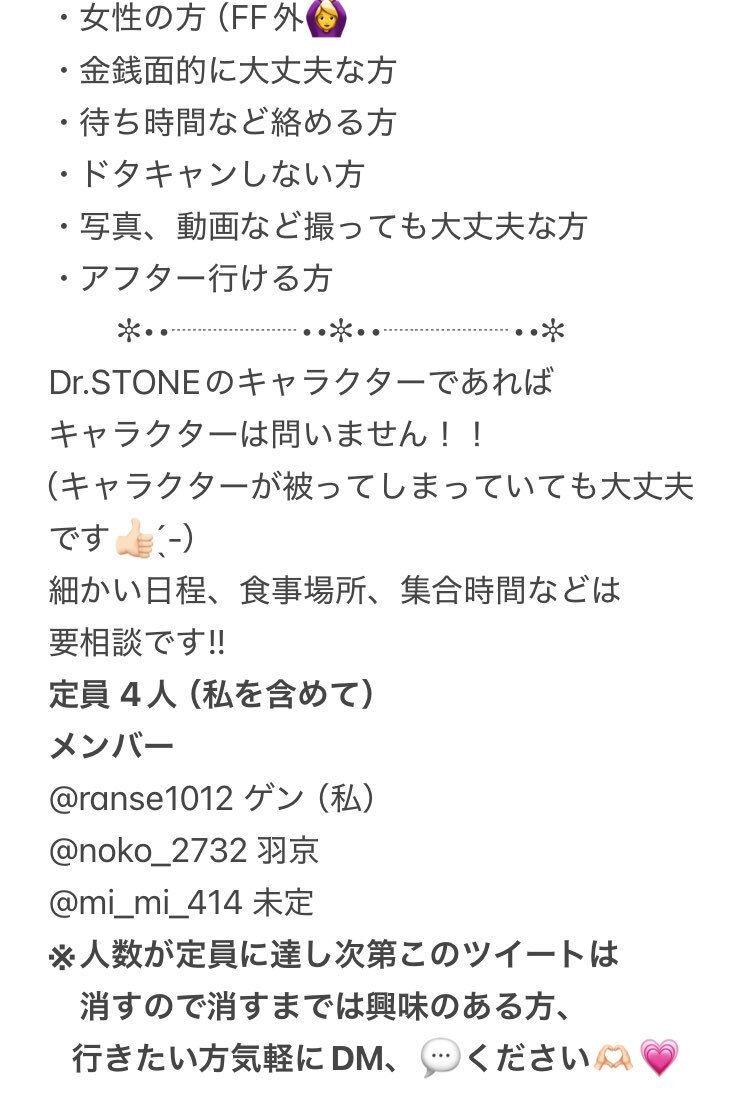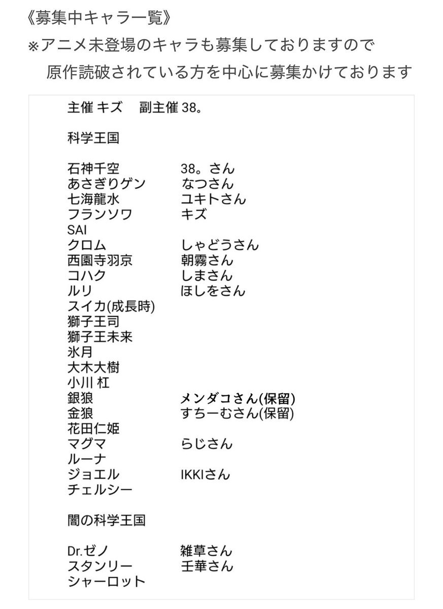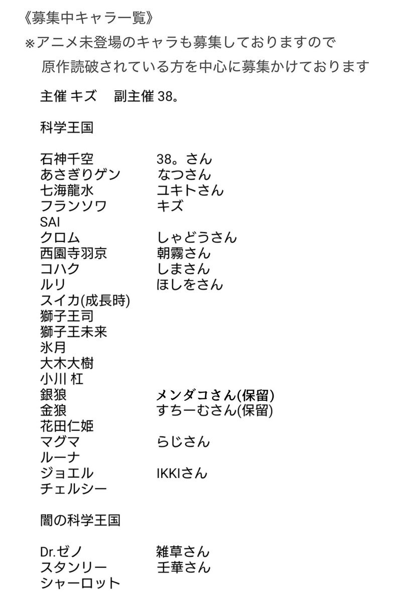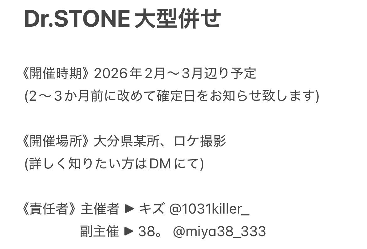 Dr.STONE併せ募集🍀*゜ 来年の3月以降の関東内のアコスタで やる予定です!残り1名様お待ちして おります😆🌟興味のある方、是非気軽に 💬、DMください⸜🙌🏻⸝💕 #併せ募集 #併せメンバー募集 #ドクスト併せ pic.x.com/X8ee3YRg2Z
