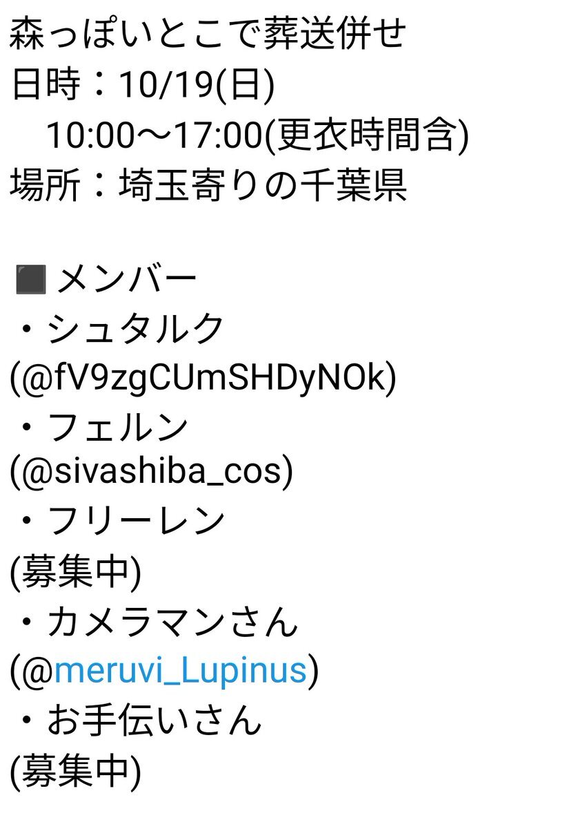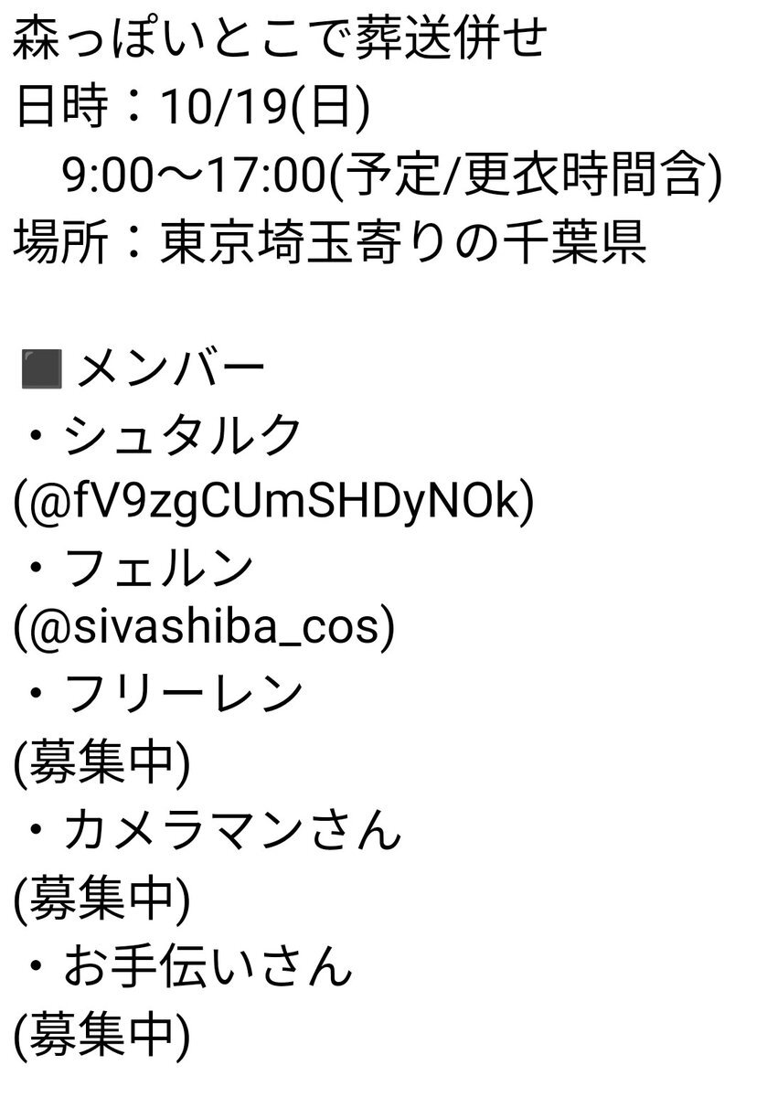 10/19(日)関東で葬送の野外ロケ予定です(詳細添付参照/情報更新有) フリーレン様とカメラマンさんを募集しています。 (できたらお手伝いさんも) 時間は今のところ目安。変更の可能性有。 質問・応募はリプか私までDMください。 #併せメンバー募集 #コスプレ併せ募集 #カメラマンさん募集