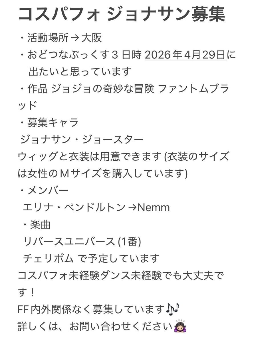 コスパフォメンバー募集!! 4月29日のおどつなに出演したいと思っています! ジョナサン募集中です! ウィッグと衣装は用意します ダンス経験無しでも大丈夫です! どしどしリプください!😭 #コスパフォメンバー募集 #併せメンバー募集 #併せ募集 pic.x.com/DeD4gRnAsH