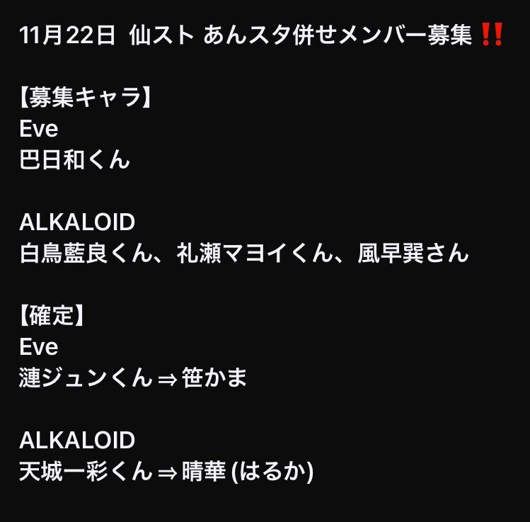 【併せ募集】 11/30(日)にtwstの併せに参加していただける方を募集しています!✨ 添付画像を最後までご確認の上リプまたは主催のDMまでお気軽にお声掛けください! #併せ募集 #併せメンバー募集 pic.x.com/DL4SwAY8Jb