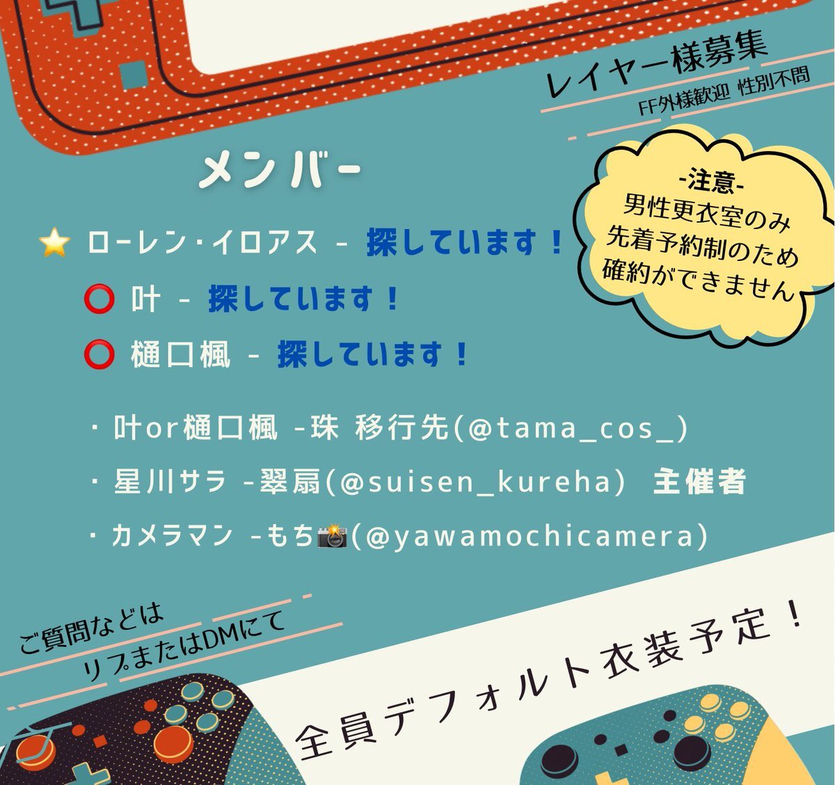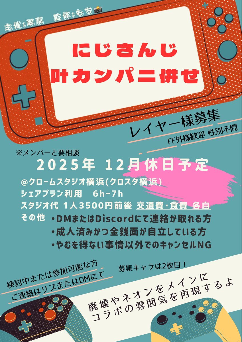 【 🌈🕒 併せ募集】 こちら更新しました! レイヤー様をあと2名募集しております! 特に🗝️💸で参加していただける方ぜひ!! 添付画像をご一読のち、お気軽にリプまたはDMお願い致します! FF外検索からも大歓迎です🙌 #併せメンバー募集 #併せ募集 x.com/suisen_kureha/…