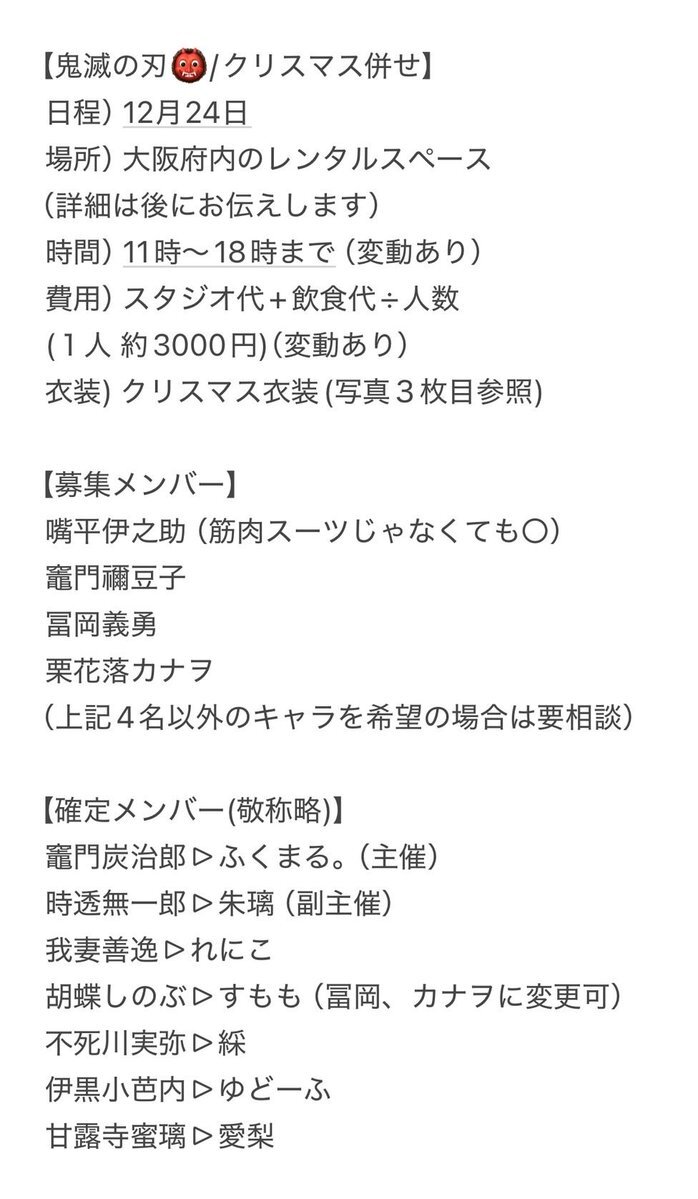 【絶賛募集中!】 今年の池ハロ2日目に、鬼滅の刃の併せ交流会(キャラ被りOK)を企画します😃✨ もし、鬼滅コスで参加される方居ましたら交流したり集合写真撮りませんか? FF外からでも大丈夫です‼️ もし、気になる方居ましたらコメントまたはDMよろしくお願いします🙇 #併せ募集 #併せメンバー募集 pic.x.com/IpjgtdbTTu