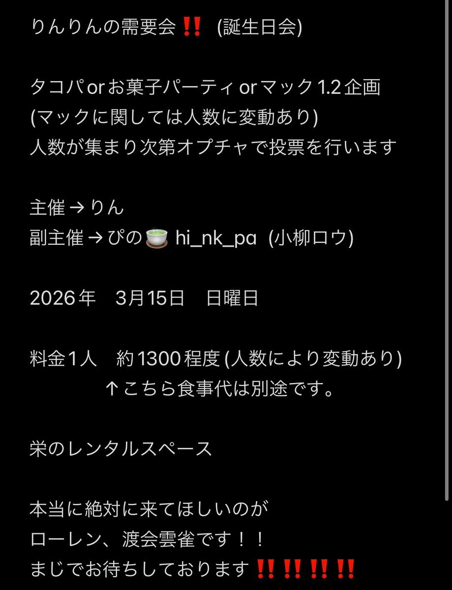 りんりんの需要会‼️(誕生日会) 3月15日に自分の誕生日会を開催したいと思います‼️ 自分の推し、好きなキャラを集めたいので クロスオーバーになります。 参加したい方はリプやdmを頂けると助かります🥺🙏🏻お待ちしております 参加者 相互、相互の相互でお願いします。 #併せ募集 #併せメンバー募集 pic.x.com/i5eW2Aynjl