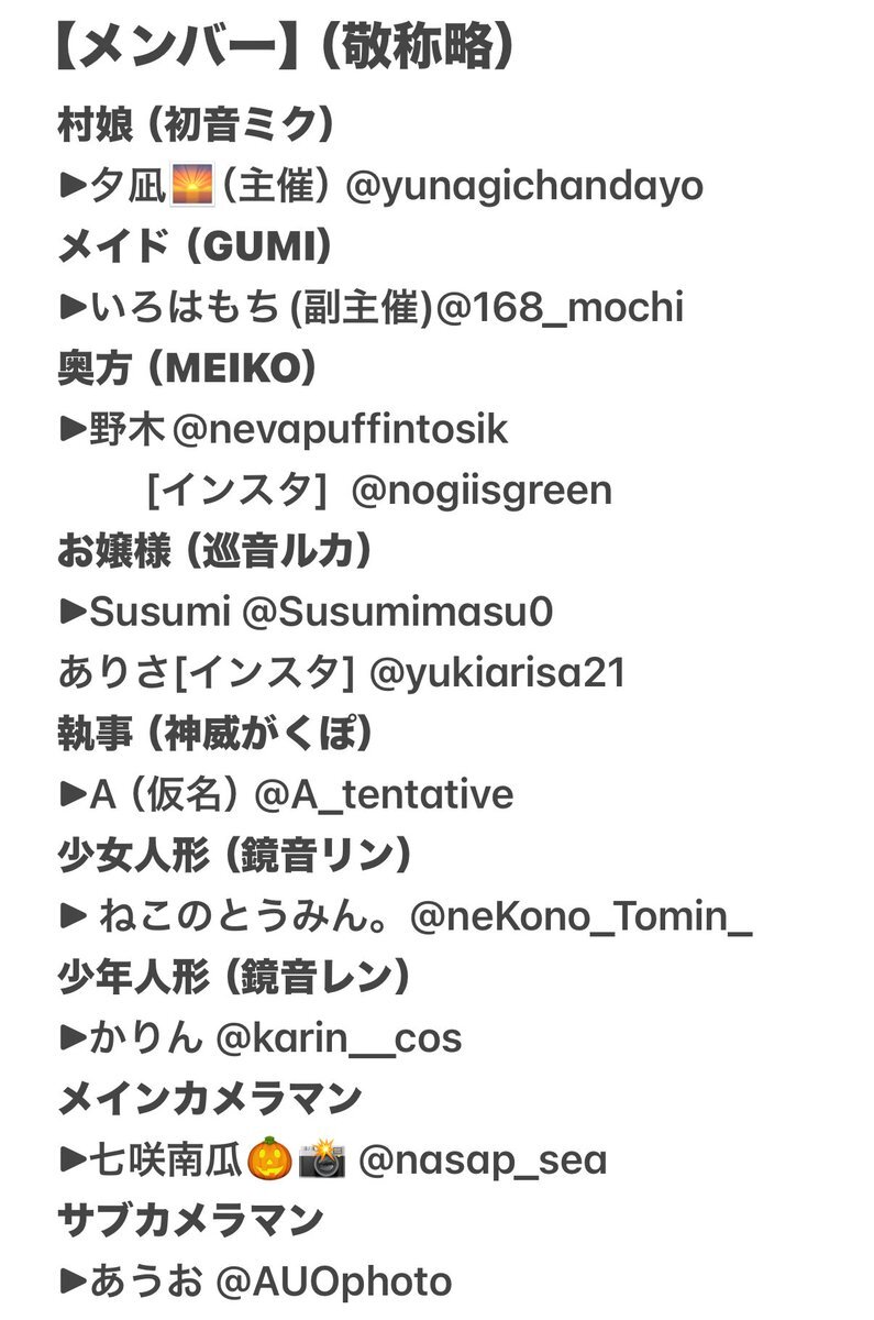 【ボカロ nightシリーズ併せ】 11/29(土)に八王子市内にて併せを行います🫧 気になる方がいましたらDMにてお声がけお待ちしております🍀 ラスト1役者のみなので是非気になる方よろしくお願いします🙇♀️ #併せ募集 #併せメンバー募集 #カメラマン募集 #レイヤー募集 拡散して頂けると嬉しいです😌