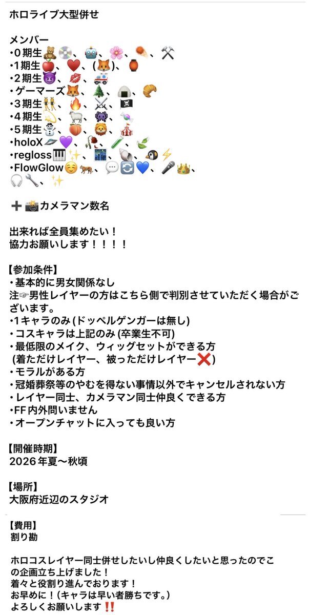 【併せ募集】 ※タップ推奨 来年の夏〜秋頃にホロライブ大型併せを企画しております‼️ 現在自分含め16名(変動あり)の方が参加予定です! 少しでも気になる方は私茶霧までDMください! 詳しくは下の画像をご覧ください🙇♀️ #併せメンバー募集 #併せ募集 #拡散希望 #hololivecosplay pic.x.com/1CA4YUKKEX