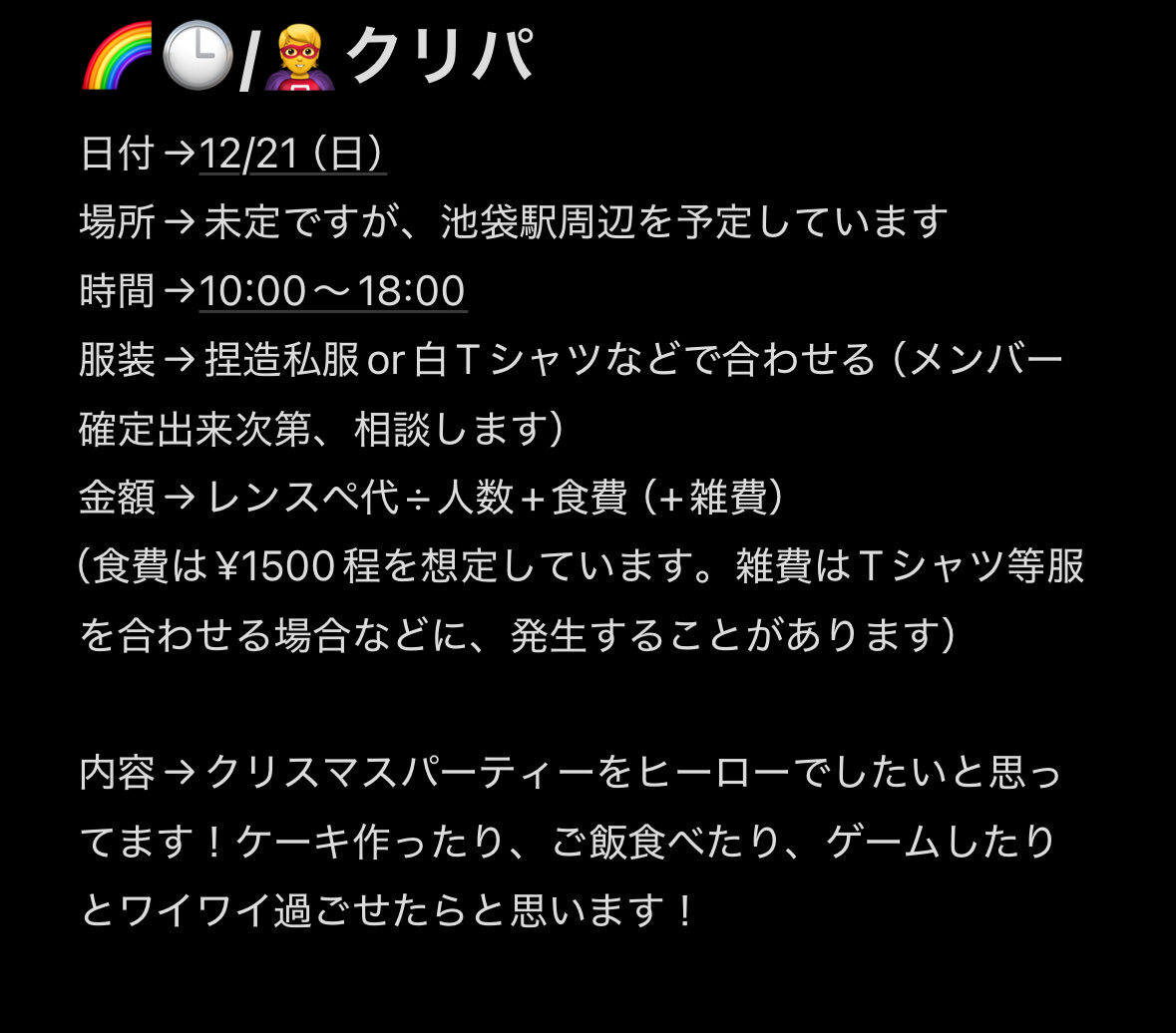 【🌈🕒 🦸クリパ 併せ募集】 12/21(日)に🦸でクリパを行うにあたって、🤝・🔫🥷の2名を募集してます!! 内容は↓の画像をよく読んでいただいてから、連絡いただけたらと思います。 検索からも、お声がけください☺️ #併せ募集