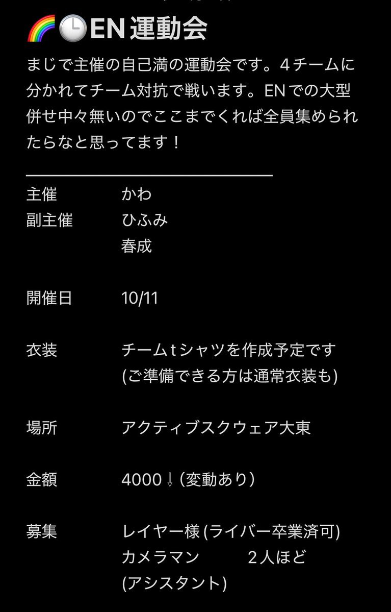 参加者募集!! 2026年5月2日に静岡市内の体育館にて🌈🕒大運動会を行います! そして参加してくださるライバーさんを募集します!F外様からも大歓迎です!! #コスプレイヤーさんと繋がりたい #にじさんじレイヤーさんと繋がりたい #併せメンバー募集 #拡散希望 pic.x.com/2LZL0G3jfv