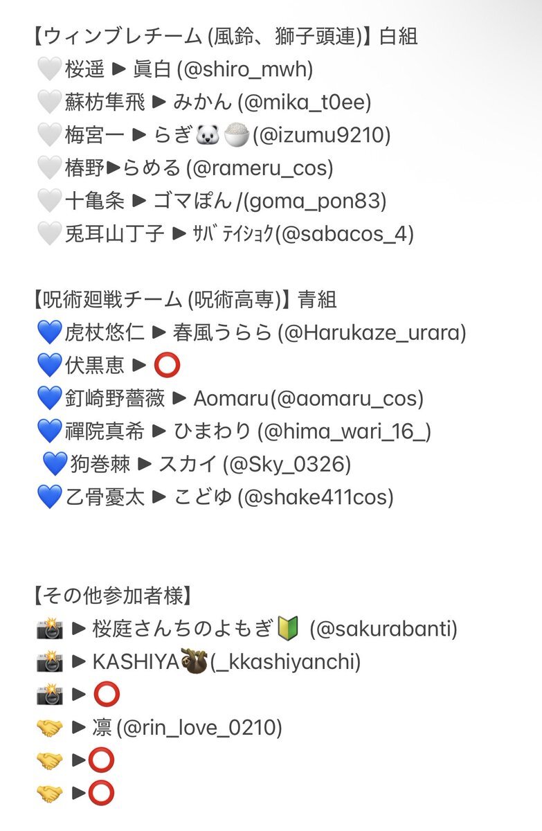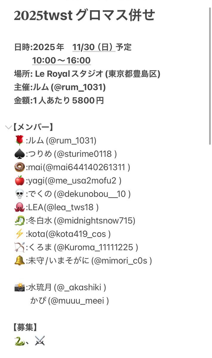 今月24日池ハロナイトにてスタレ併せ、26日池ハロ2日目にて原神併せを行います。 現在予定のメンバーや備考は画像をご覧ください。 FF内外問わず参加希望の方はリプ大歓迎です! よろしくお願いします。 #池ハロ2025 #併せ募集 #併せメンバー募集 #コスプレイヤーさんと繋がりたい