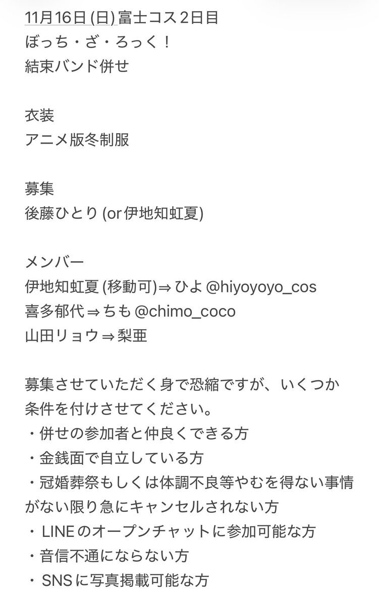11月16日の富士コスでぼざろ併せをやる為、ぼっちちゃん、もしくは虹夏ちゃんで来ていただける方を募集しています‼️ FF内外問いませんので興味ある方がいましたらお気軽にご連絡ください 日程迫ってますがあと1名で全員揃うのでよろしくお願いします🙇♀️ #併せメンバー募集 pic.x.com/Yju7FEou11