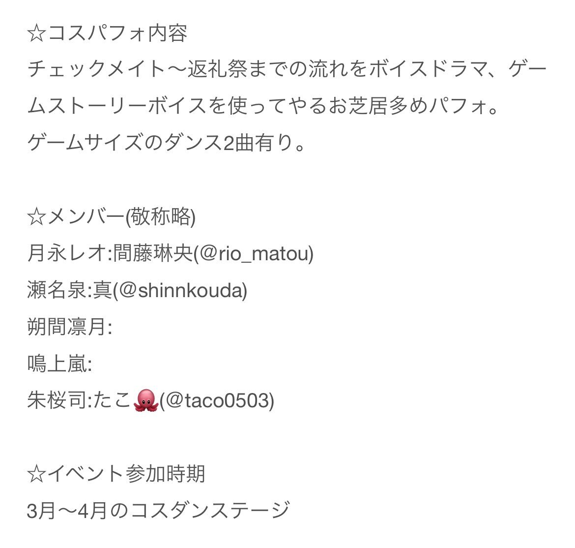 【コスパフォメンバー募集】 3月〜4月のコスダンであんスタ Knights のコスパフォに参加して頂ける凛月、嵐レイヤーさんを募集します!! 詳細ご確認の上、ご興味あるはお気軽にDMにご連絡下さい!FF内外問わずです!⚜️ #コスパフォメンバー募集 #併せメンバー募集 #併せ募集 pic.x.com/dSHRCOeEbe