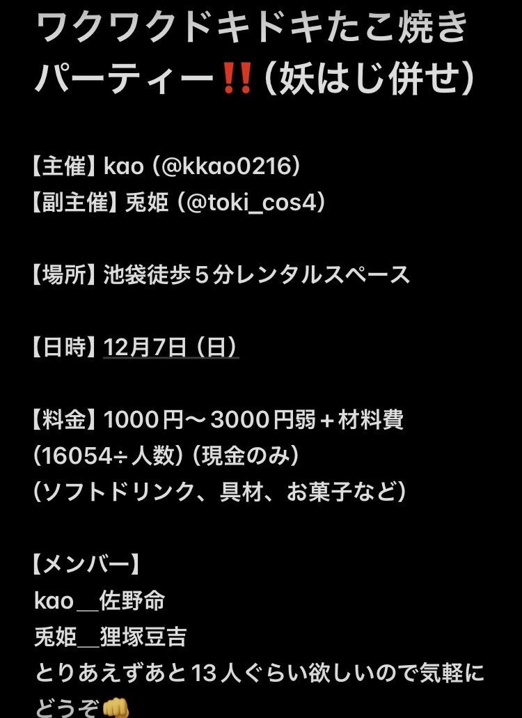 【募集‼️】 12月にyuhjキャラでタコパをするためメンバーを募集してます‼️🐙💥 詳細は画像二枚をご参照ください💕 検索からでも気軽にお声がけ下さい‼️🙇 #併せ募集 #併せメンバー募集 pic.x.com/FAHTwf0CvS