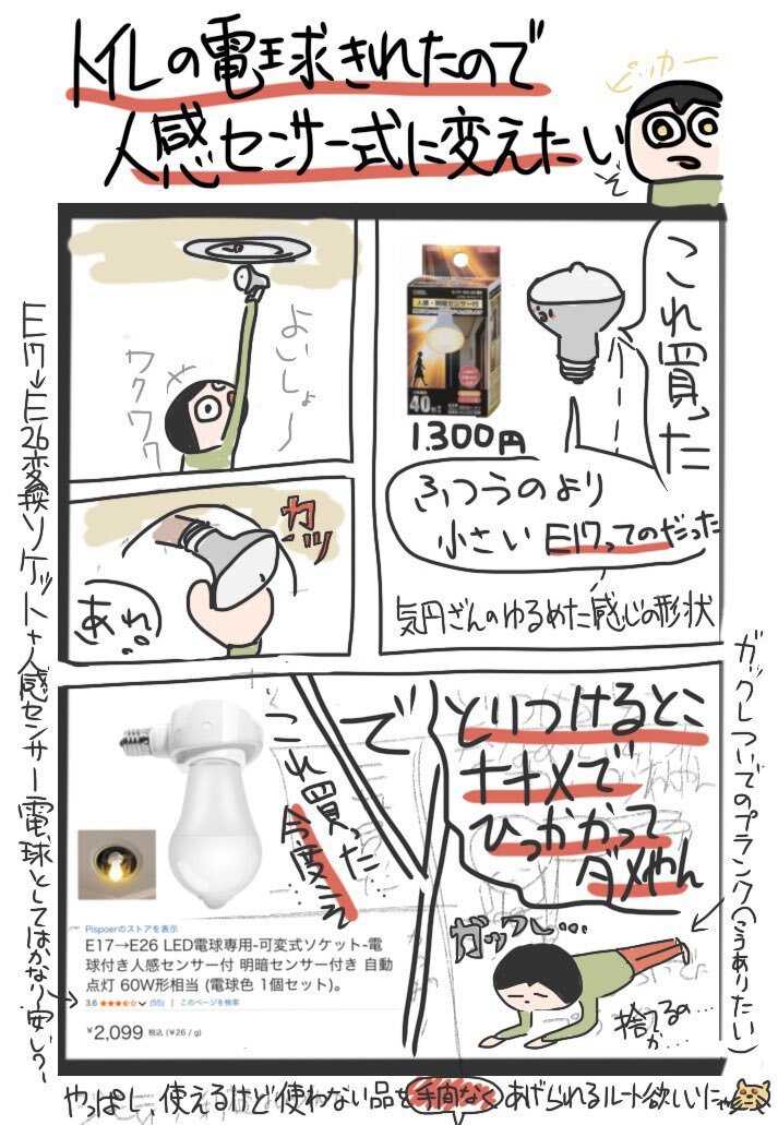 💡トイレの電球変えたら、ダメだった(それだけ) ・人感式センサで、自動化したい ・失敗でも揺るがない心欲しい ・メルカリ(労力がかかる印象持っちゃってる) 対策 ・労力を労力と感じないように修行する ・ジモティなど人にすっとあげられるルートを開拓する 小さな #修行 #イラスト #電球 pic.x.com/EHKpfF7s5v