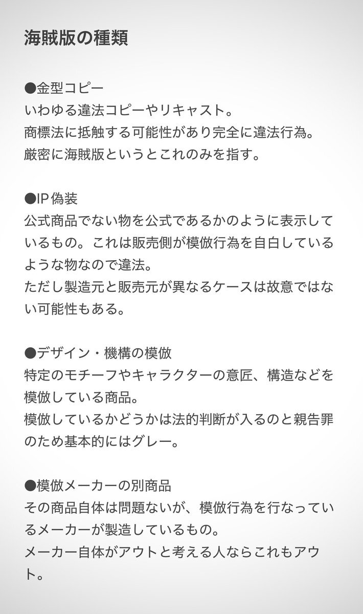 (´-`).。oO(これ線引きが難しいので強く否定するなら海賊版の定義を明示ちとくのをオヌヌヌ。 例えば一部でもマシニーカ模倣がアウトやったら中華美プラが結構対象になる。 模倣メーカーが出してる模倣ちてないプラモもダメってなると中華プラモ購入者はほぼ全員ブロック対象になるのよね。 x.com/pecoleum929/st…