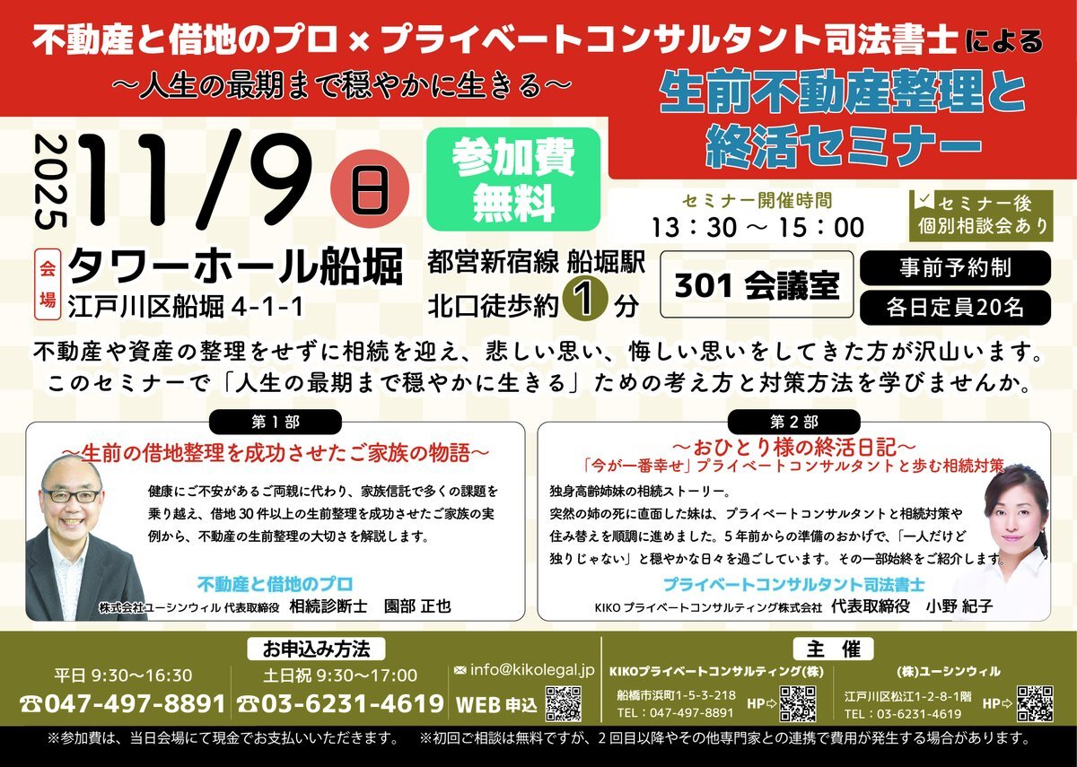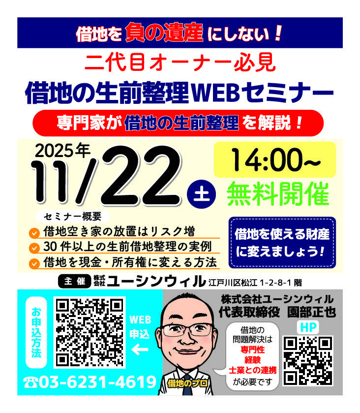 【借地生前整理 WEBセミナー】 借地の所有や居住はリスク増加の今! 二代目オーナー様へ。 借地を使える財産に変える方法を、経験豊富な専門家が解説。 11/22(土)14:00/参加費無料 QRコードから参加申込を! forms.gle/GMrc66ACo7oMnn… #借地 #WEBセミナー #セミナー #生前対策 #相続対策 #空き家 pic.x.com/yylzols6dY