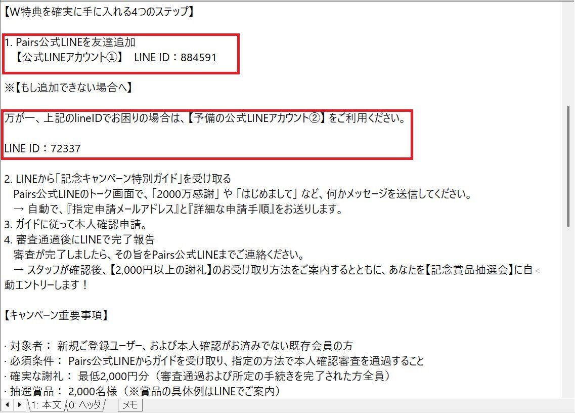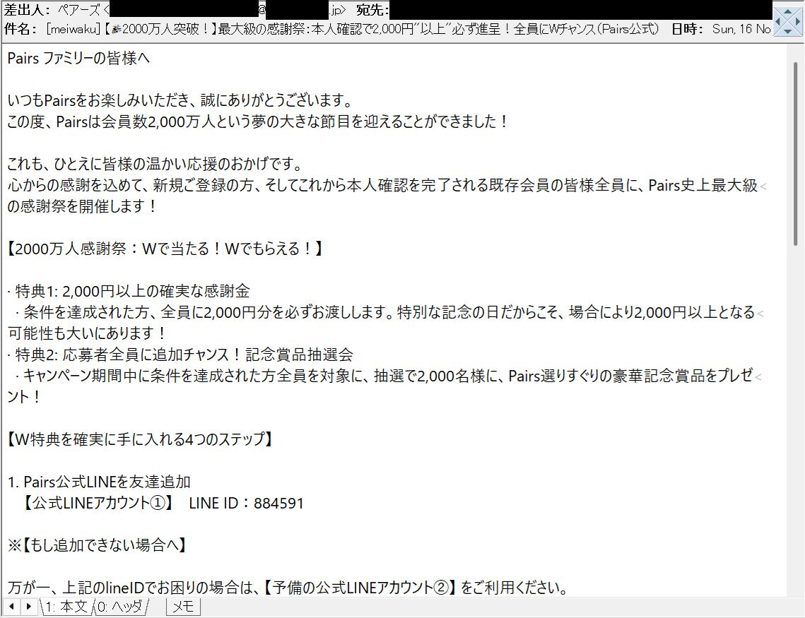 【🎉2000万人突破!】最大級の感謝祭:本人確認で2,000円"以上"必ず進呈!全員にWチャンス(Pairs公式) ペアーズ/Pairsを騙る #不審メール/#詐欺メール。 LINEでの友だち追加を求めていますが、メール本文記載のLINE IDは #偽物 です。 犯罪に巻き込まれる可能性がありますので、友だち追加しないで! pic.x.com/6Mor5pZ1yC